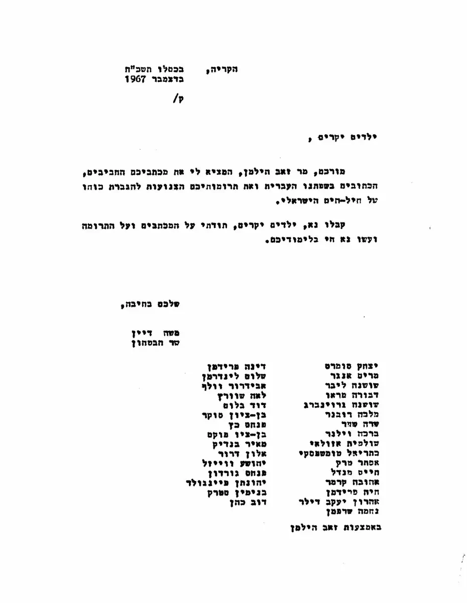 שר הביטחון, משה דיין שקיבל את המכתבים של התלמידים החזיר להם מכתב תשובה בו כתב: "מורכם, מר זאב הילמן, המציא לי את מכתביכם החביבים, הכתובים בשפתנו העברית ואת תרומותיכם הצנועות להגברת כוחו של חיל- הים הישראלי. קבלו נא, ילדים יקרים, תודתי על המכתבים ועל התרומה ועשו נא חיל בלימודיכם. שלכם בחיבה, משה דיין שר הביטחון".