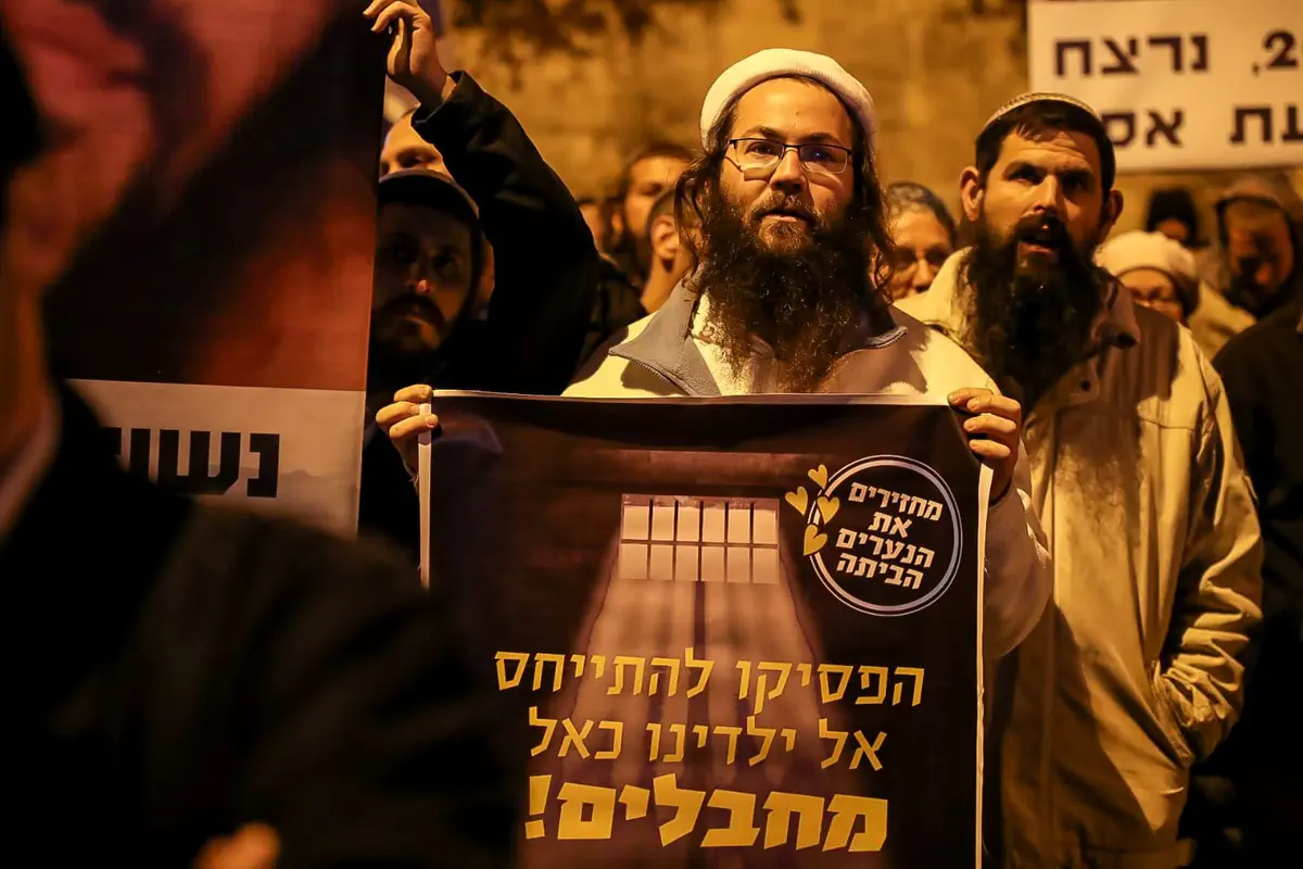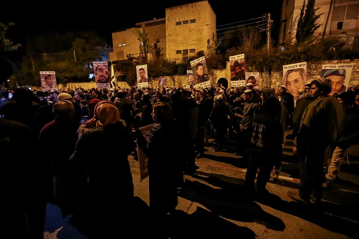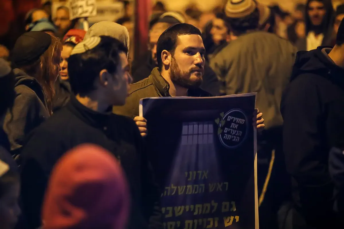 כאלף איש מפגינים הערב (מוצאי שבת) מול בית ראש הממשלה בנימין נתניהו במחאה על מעצר הנערים בשב"כ.