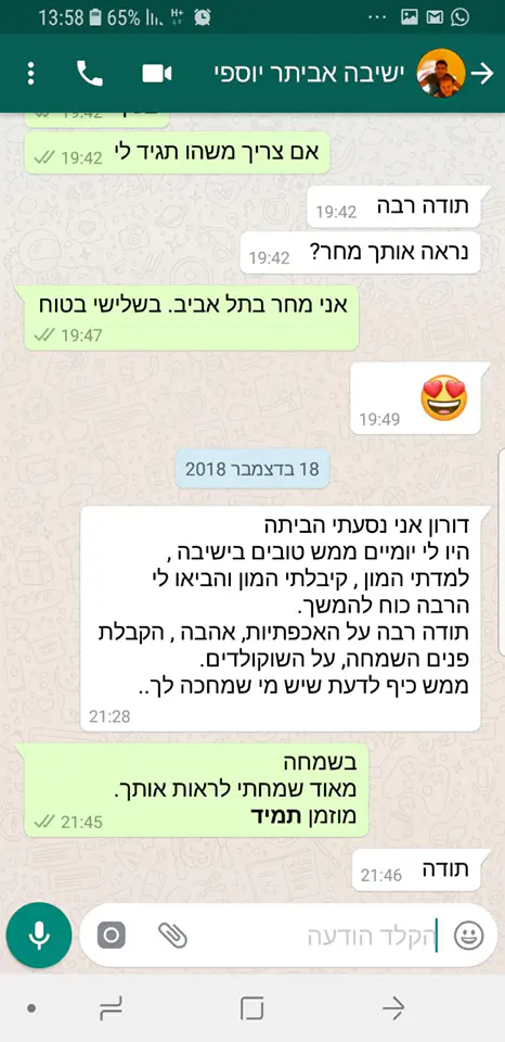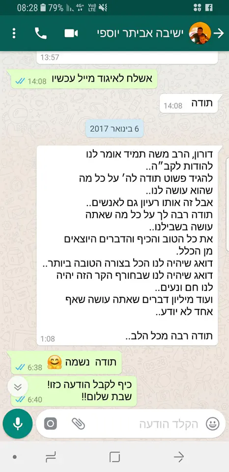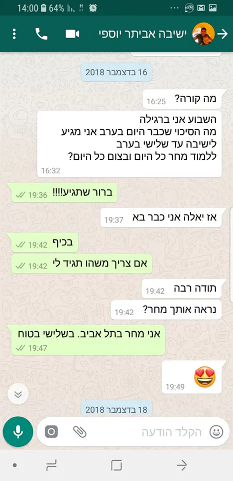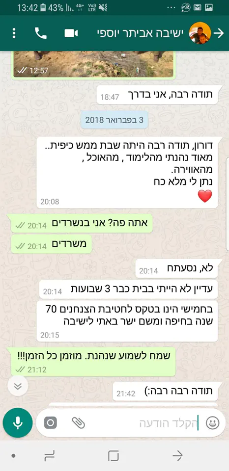 רציתי לפרסם את ההתכתבויות האחרונות שלי איתו: אביתר לא היה בבית שלושה שבועות, אבל בא בישיבה לפני שהוא נוסע הביתה. אביתר ברגילה מגיע לישיבה בצום עשרה בטבת, כדי ללמוד. וגם אחרי הביקורים אצלנו, אביתר לא מפסיק להודות על כל דבר קטן.