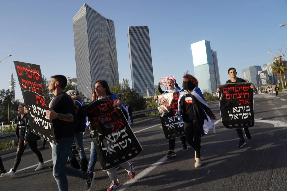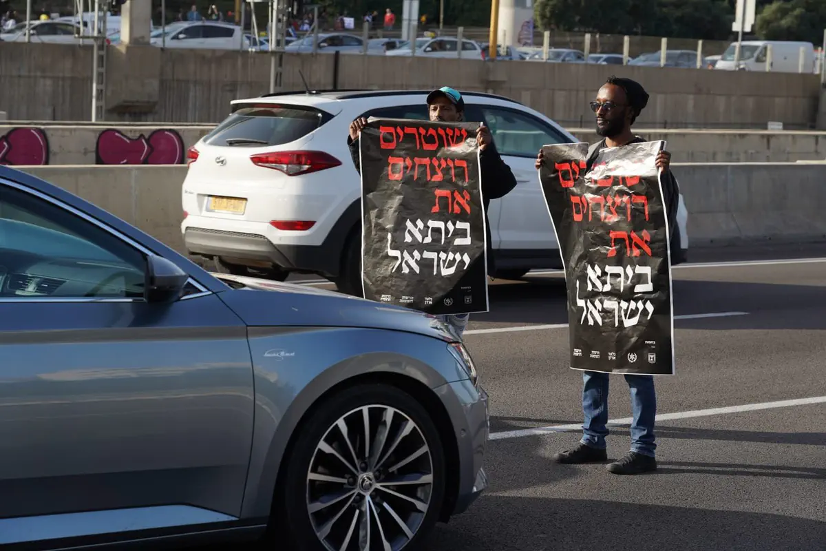 המפגינים נושאים דגלי ישראל ושלטים שעליהם נכתב: "שוטרים רוצחים את ביתא ישראל", "המחלקה לחיפוי שוטרים" ו"מדינת משטרה".