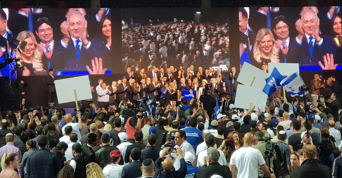 "זה לילה של ניצחון אדיר. לפני 23 שנים זו היתה הפעם הראשונה ששרה ואני עמדנו כאן והנה אנחנו חוזרים לעשות זאת בזכותכם חברי הליכוד", אמר נתניהו.
