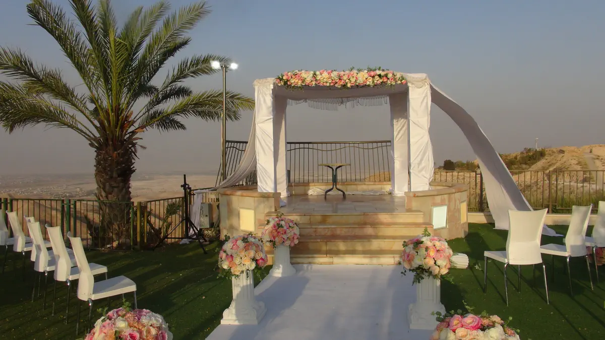 ביקור בגן האירועים, מושך את העיניים באופן כמעט מיידי אל החופה. "החופה שלנו היא גולת הכותרת של המקום, כשממנה נשקף הנוף המדהים למרגלות הרי יהודה. היא מעוצבת באופן ייחודי על ידי מעצבת הבית שלנו", מספר המדינגר.
