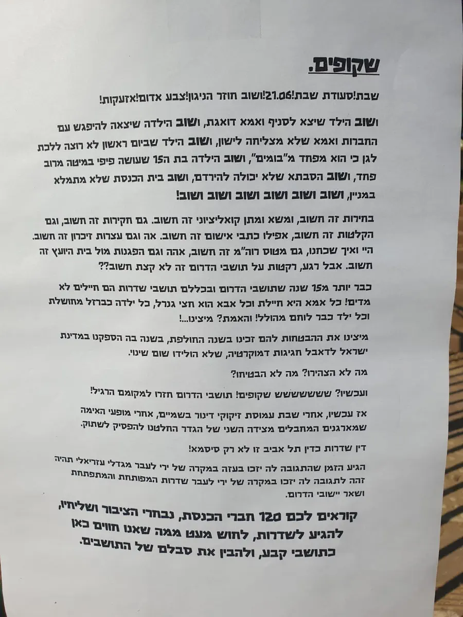 "מזמינים אתכם, 120 חברי הכנסת, נבחרי הציבור ושליחיו, להגיע לשדרות ולחוש מעט ממה שאנו חווים כתושבי קבע, ולהבין את סבלם של התושבים! שקופים - out, מגיבים - In...!", חתמו היוזמים.