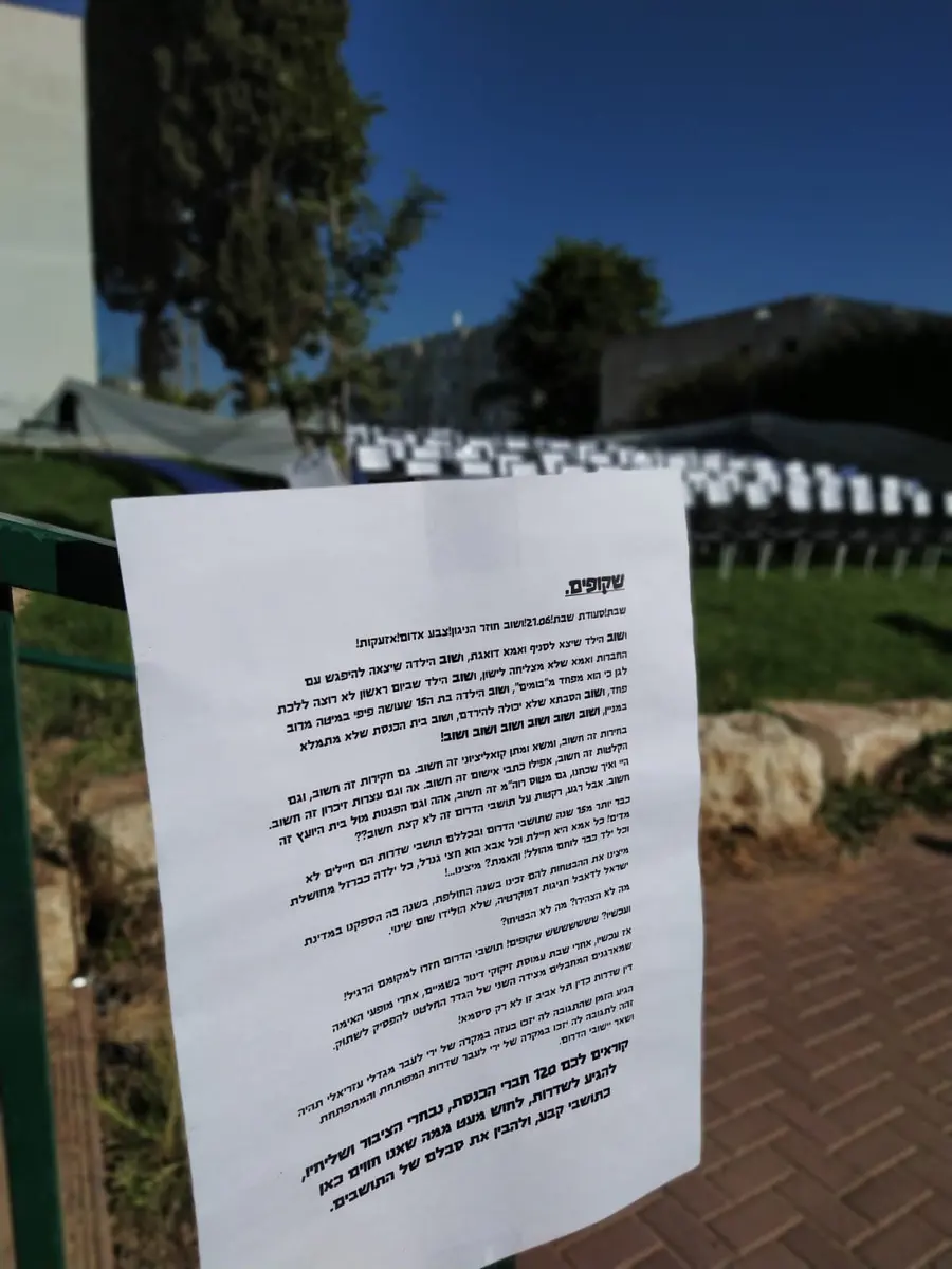כחלק מההזמנה ערכו התושבים 120 כסאות ל-120 חברי הכנסת, כאשר על כל אחד מהכסאות מתנוסס שלט "שמור" עבור אחד מחברי הכנסת.