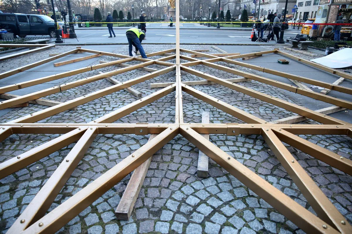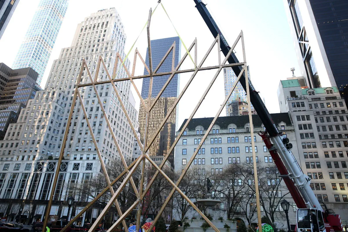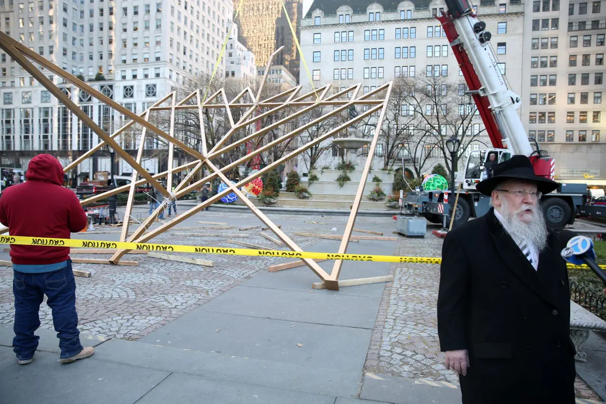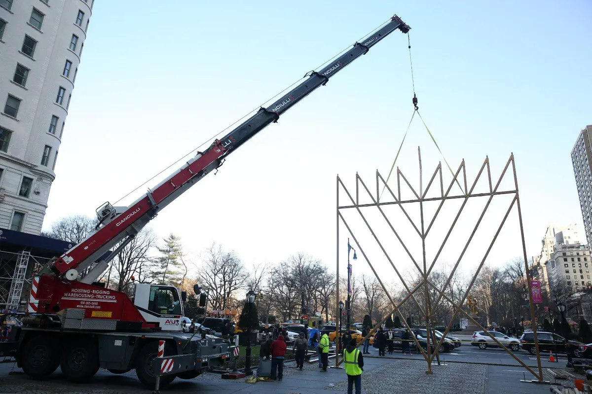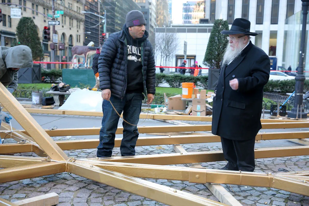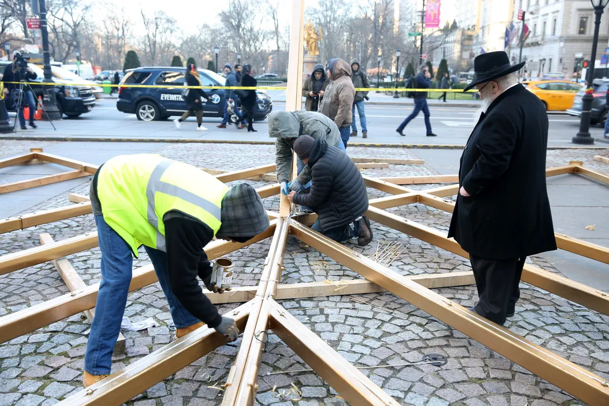 החנוכייה הגדולה בעולם, המוצבת מדי שנה בלב מנהטן על ידי חב"ד, הוקמה בימים האחרונים באמצעות עשרה פועלים, משאית ומנוף ענק.