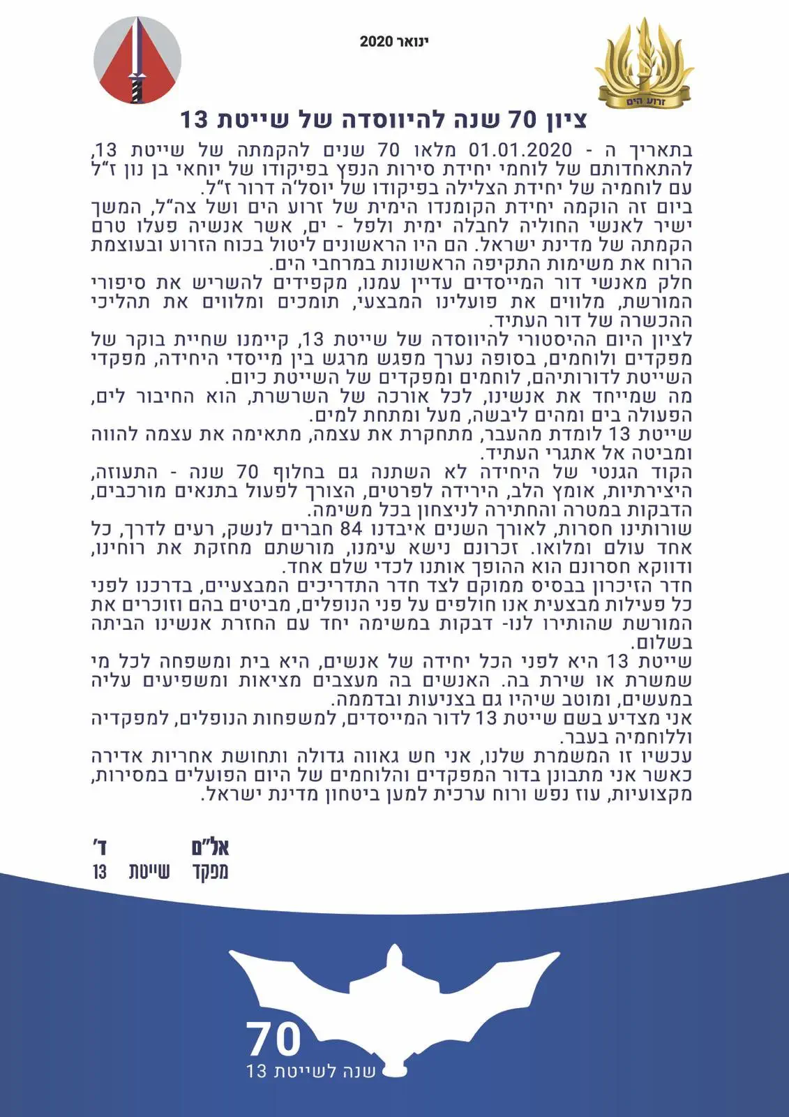 "שייטת 13" קיבלה שש פעמים את צל״ש הרמטכ״ל כשהאחרון שבהם ניתן על ידי הרמטכ"ל רב-אלוף אביב כוכבי בחודש יולי האחרון.