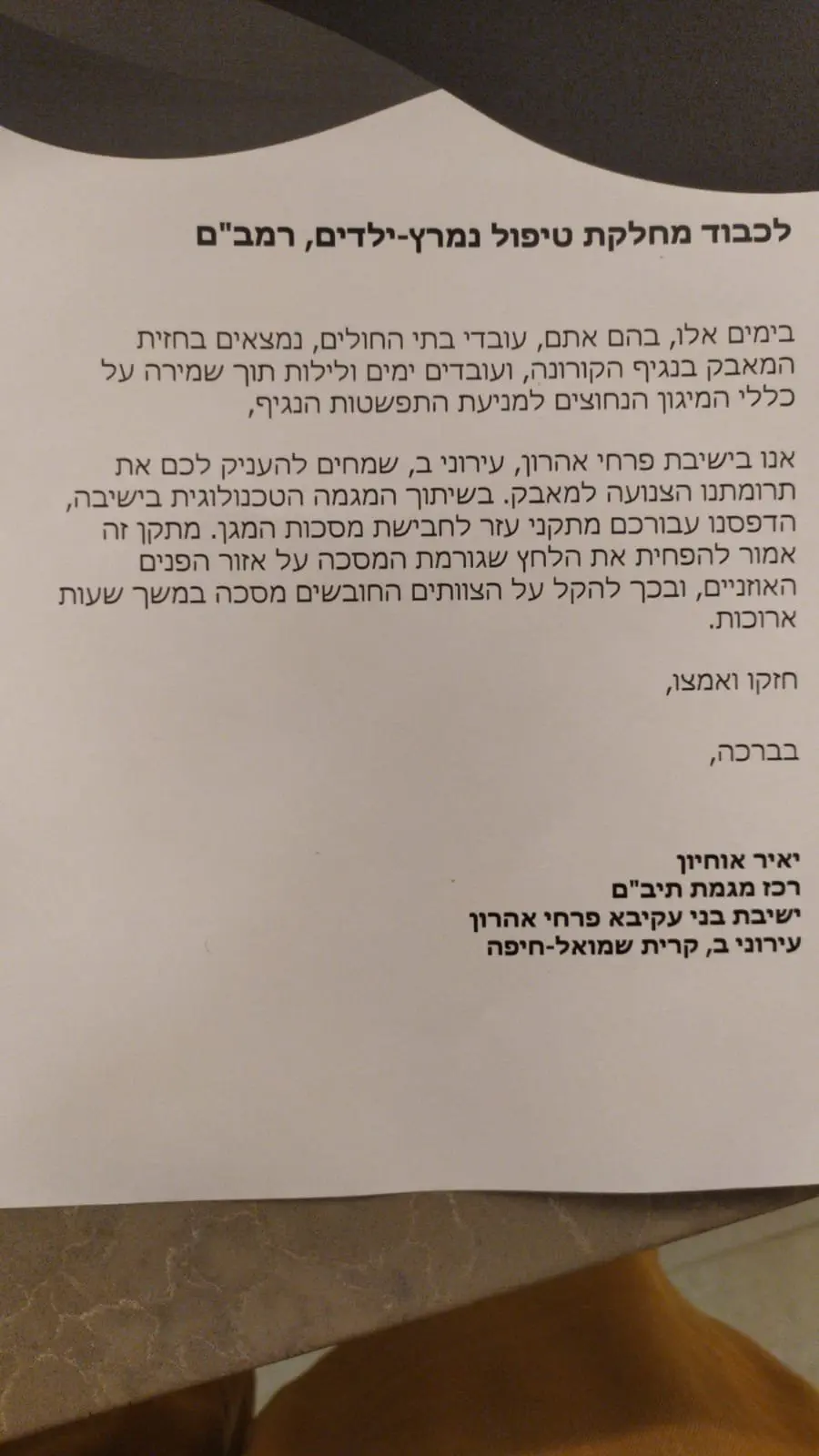 יעל ברזילי, אחות בטיפול נמרץ ילדים בבית החולים רמב"ם ביקשה להודות ליאיר אוחיון ולישיבה "על ההירתמות והמאמץ להקל עלינו את לבישת המסיכה במשך 12 שעות רצופות. אנחנו, צוות מחלקת טיפול נמרץ ילדים רמב"ם, מאוד מעריכים".