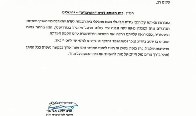 "המתפללים עושים כל מאמץ לעצור את הגזירה ואני מבקשכם, כל אחד ואחת, אנא פנו מזמנכם והגיעו מחר לבית הכנסת ומחו יחד עם מתפלליו על עצם הרעיון להרוס את בית הכנסת", הוא מבקש. "אני אהיה שם מחר משעות הבוקר, לצידם של המתפללים הוותיקים והצעירים ובתקווה שהיזם ישכיל לבנות את ירושלים, תוך שמירה על כבודו וקדושתו של המקום", הוא חותם.