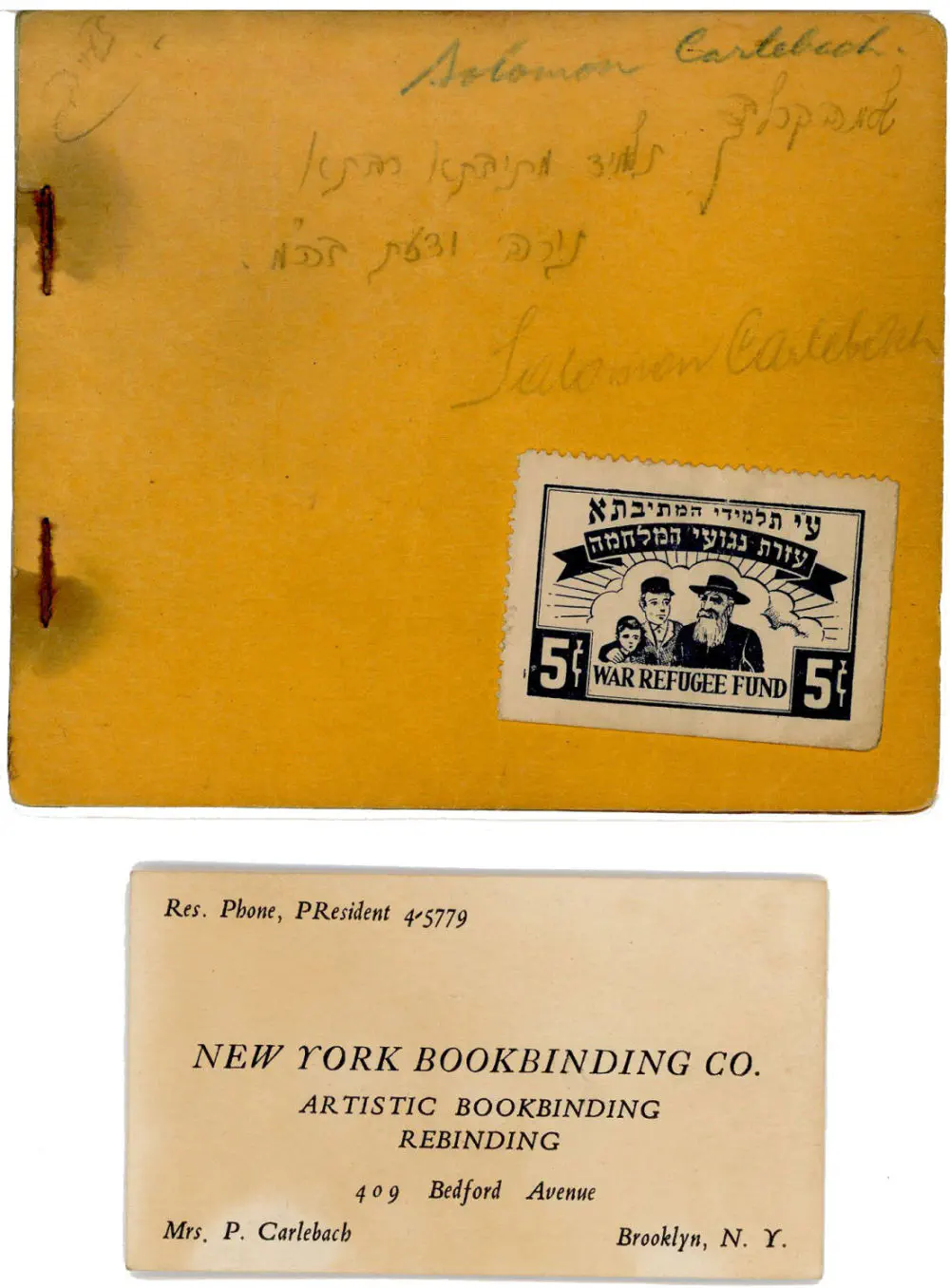 כמו כן, מוצע למכירה כרטיס ביקור לעסק כריכת ספרים של אמו מרת פסיה (פולה) קרליבך שנמצא בתוך הפנקס.
