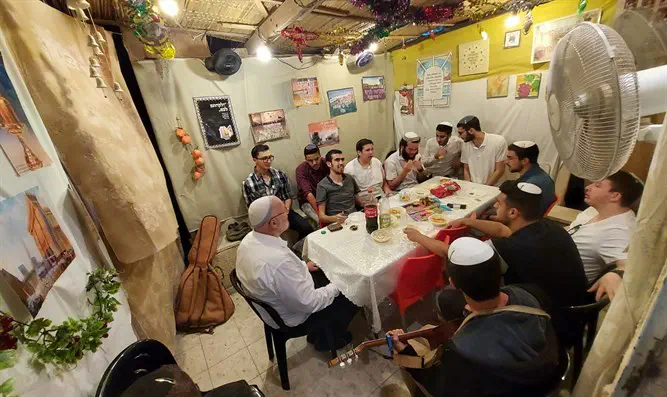 הקבלת פני רבו: תלמידי ישיבת הכותל הגיעו לסוכת ר"מ הישיבה, הרב אבנר ששר בשער הפרחים בתוככי ירושלים, לשיעור תורה ושמחת החג.