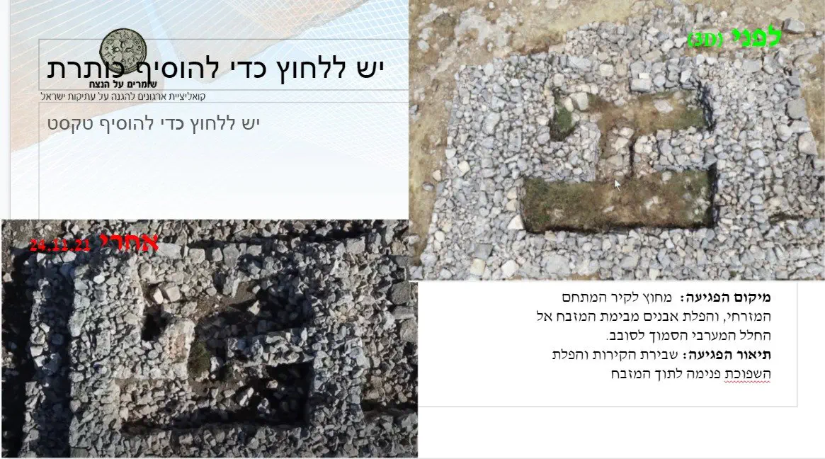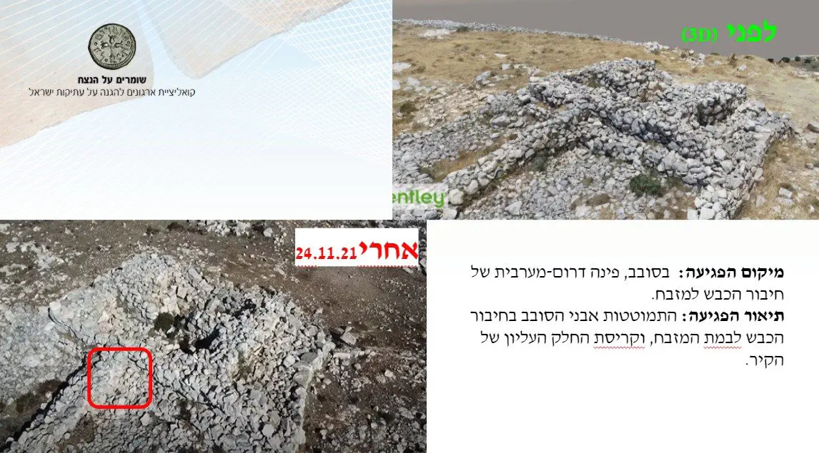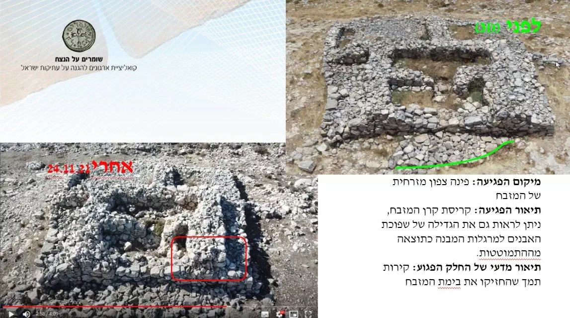 בסרטון שפרסמה עיריית עסירה א־שמאליה לפני כעשרה חודשים נראו טרקטורים גדולים שפוגעים בחומת האתר המקיפה את המזבח. אבני החומה נגרסו לחצץ לסלילת כביש שמקדמת הרשות הפלסטינית.