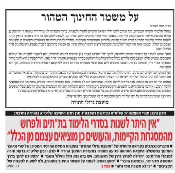 בהמשך העיתון, ישנה כתבה העוסקת בנושא המכתב של הרבנים עם כותרת: מרנן ורבנן חברי מועצת גדולי התורה ובראשם רשכבה"ג מרן ראש הישיבה בהוראה נחרצת: "אין היתר לשנות בסדרי הלימוד בת"תים ולפרוש מהמסגרות הקיימות, והעושים כן מוציאים עצמם מן הכלל".