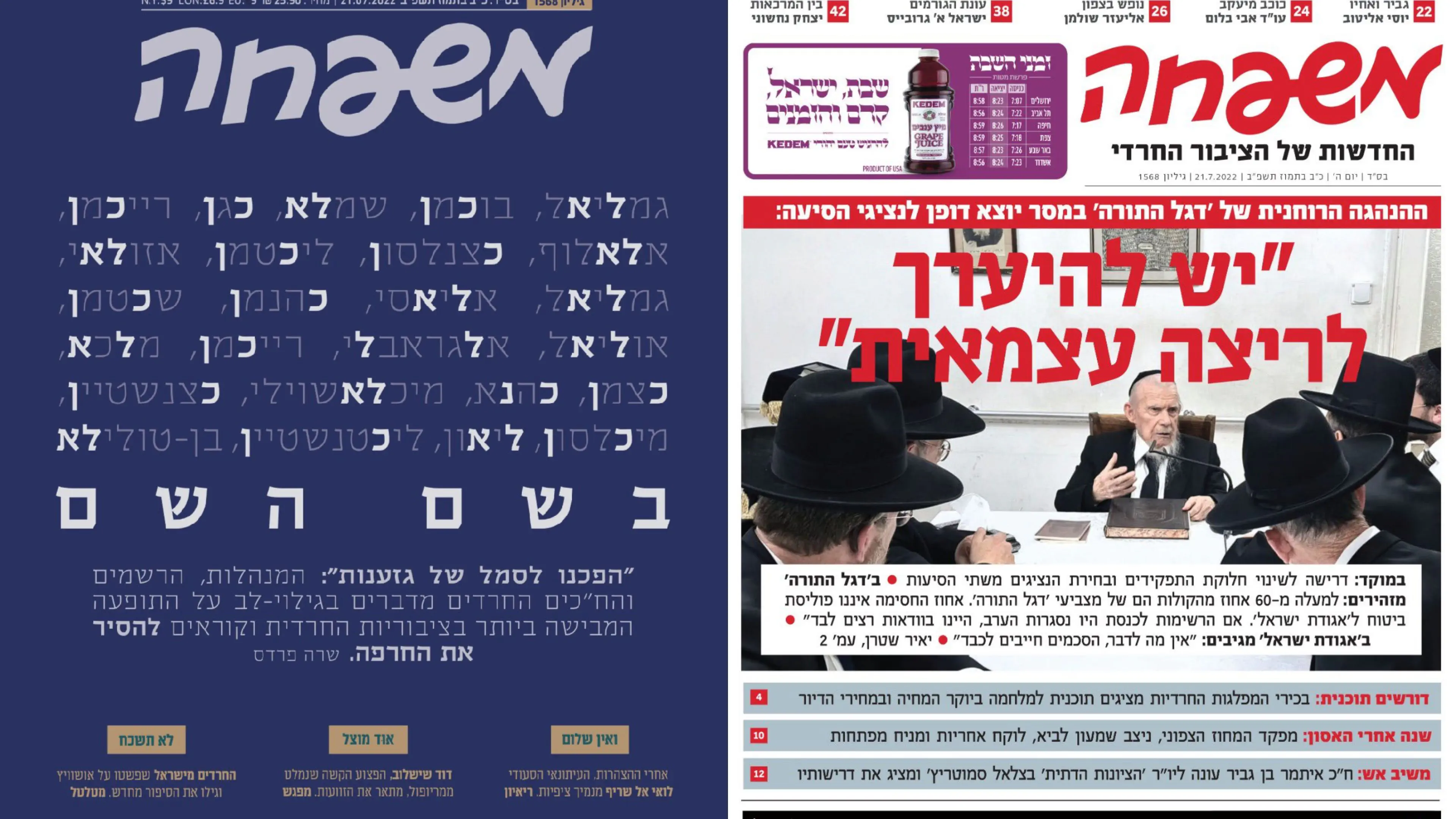 אפרופו איחוד בין המגזרים והחוגים, מוסף החדשות של 'משפחה' עם כותרת ראשית וגדולה בה מובאים דבריהם של ההנהגה הליטאית: "יש להיערך לריצה עצמאית". כאשר הסיבה היא רוב ל'דגל התורה' ודרישה לשינוי המיקומים ברשימה.
