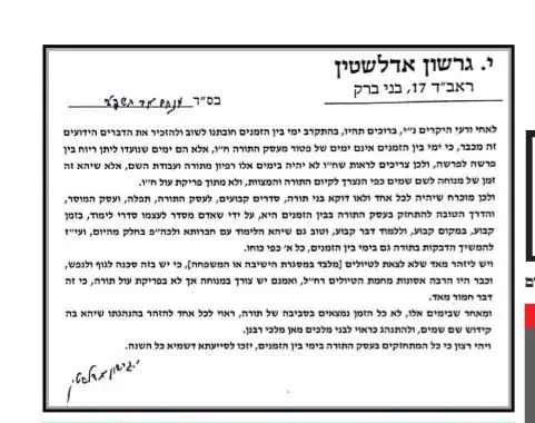 "בהתקרב ימי בין הזמנים, חובתנו לשוב ולהזכיר את הדברים הידועים זה מכבר, כי ימי בין הזמנים אינם ימים של פטור מעסק התורת ח"ו", פותח הרב אדלשטיין את דבריו במכתב שהתפרסם הבוקר (שלישי) בעיתון 'יתד נאמן'.