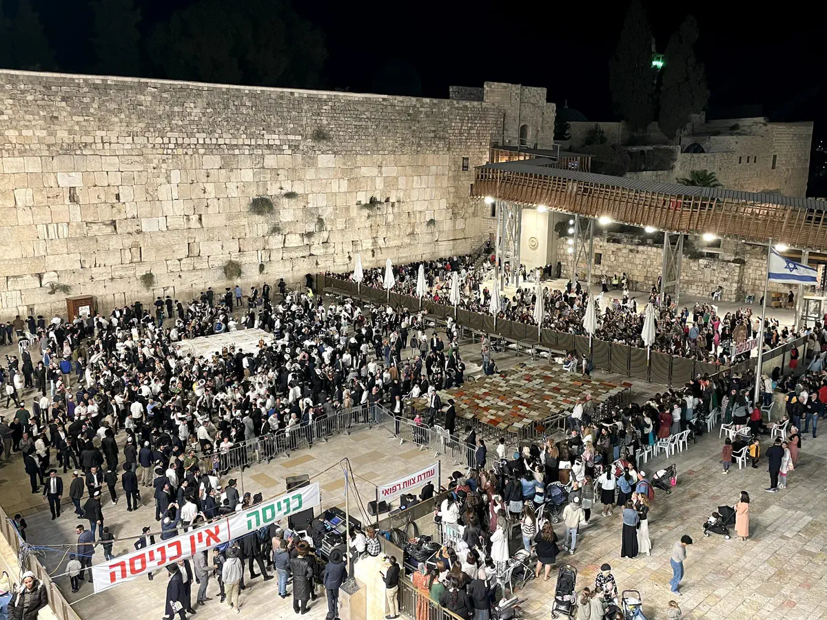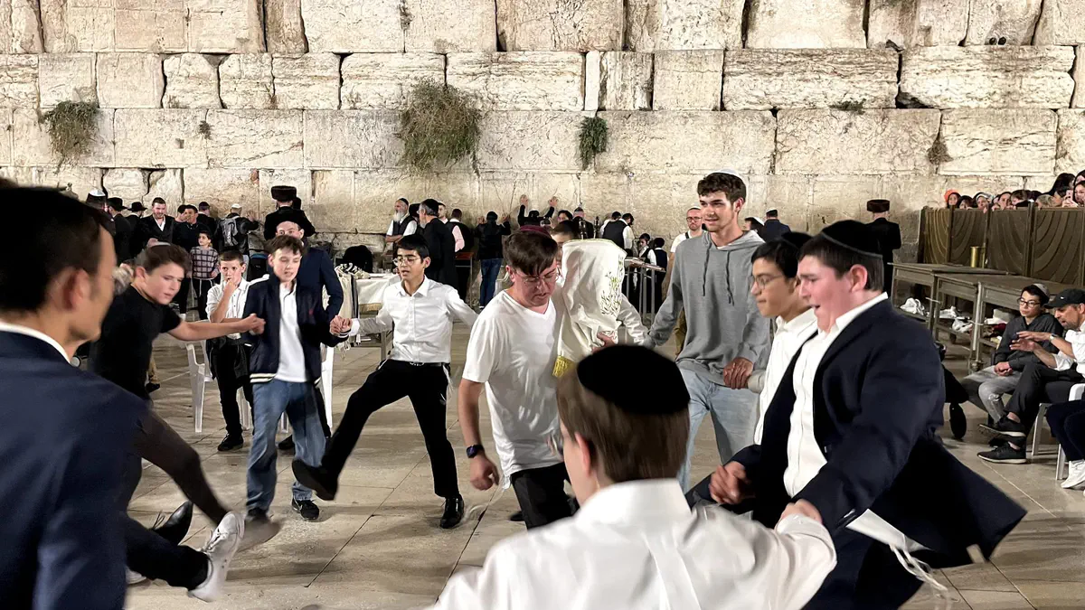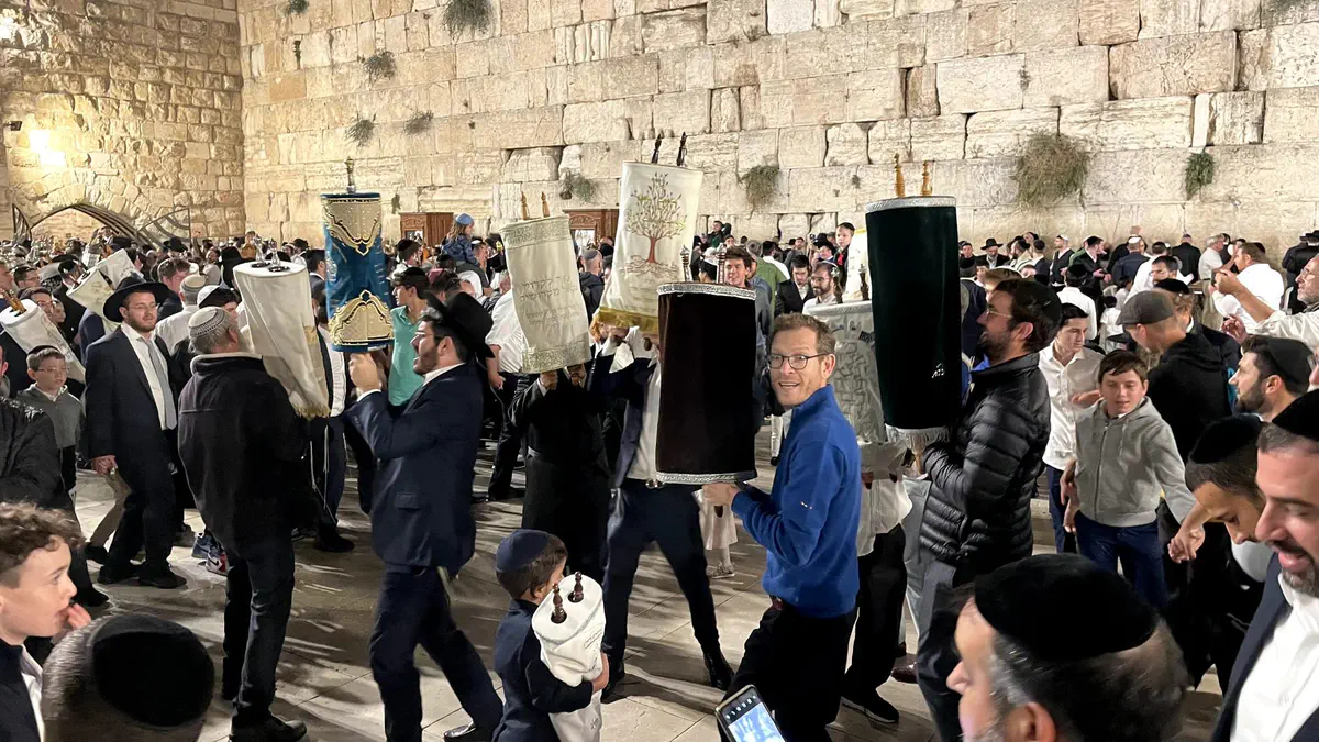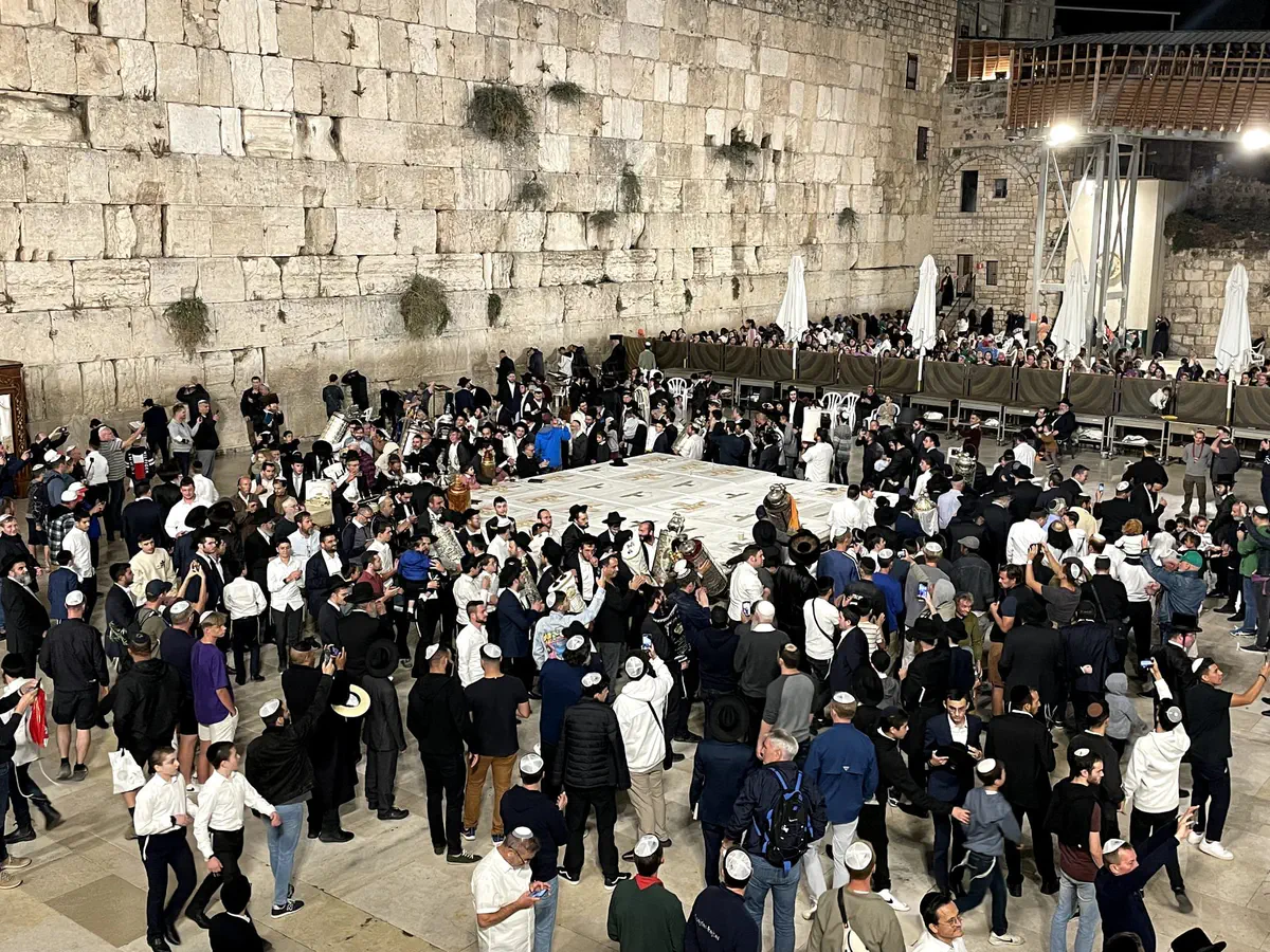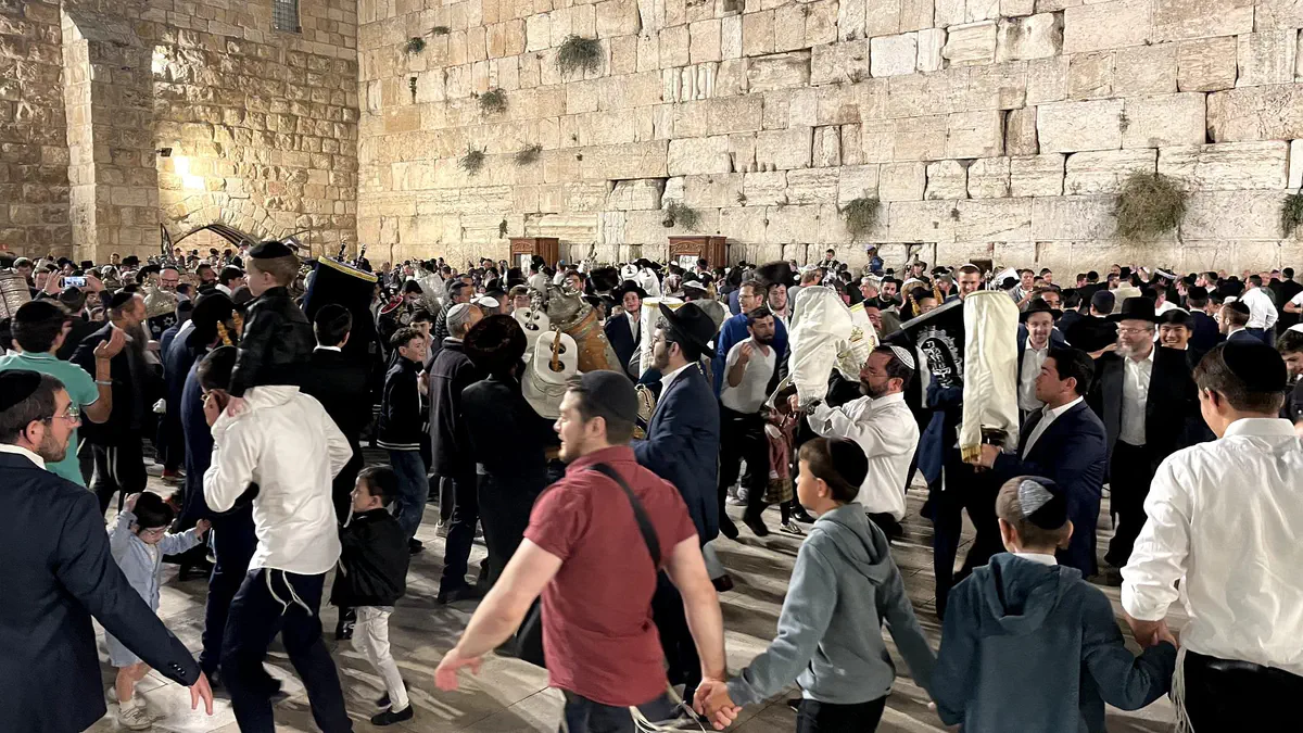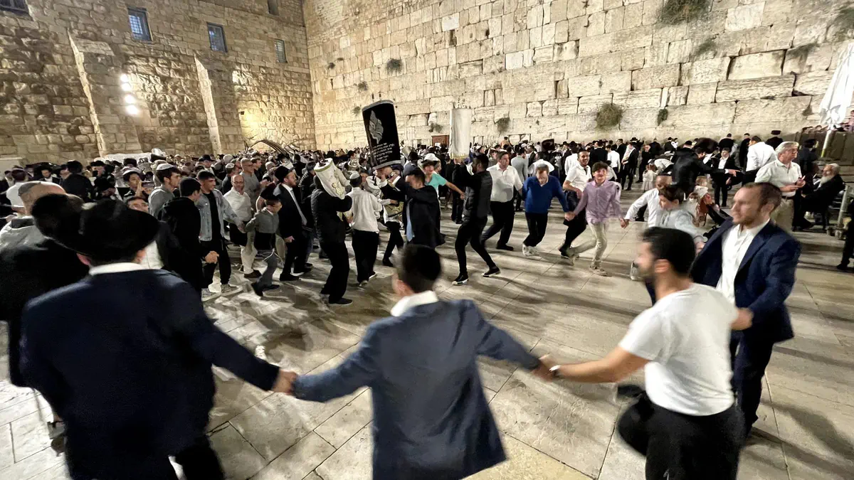 אלפי בני אדם השתתפו הערב (שני) בהקפות השניות ברחבת הכותל – שהפכו למסורת השנתית בירושלים, בריקודים יחד עם עשרות ספרי תורה.