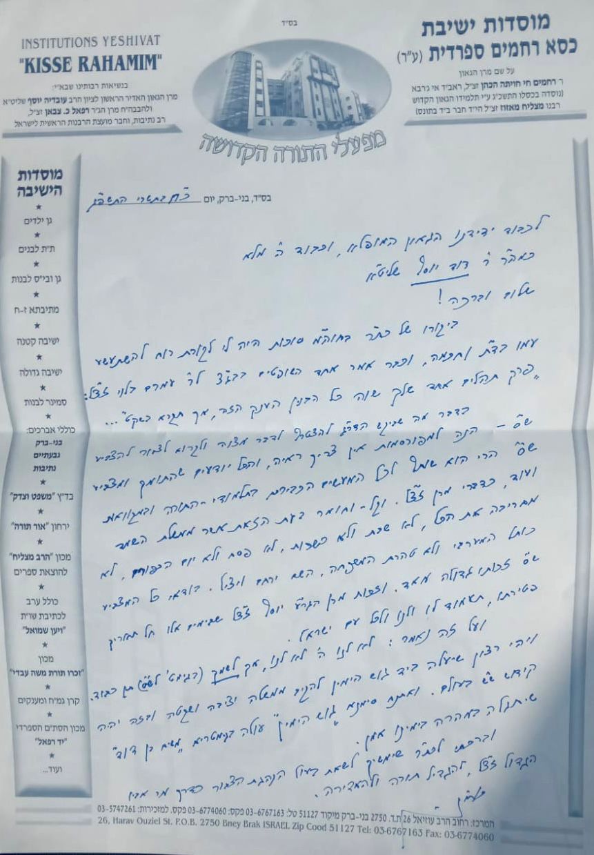 "וקל וחומר בעת הזאת אשר ממשלת השמד מחריבה את הכל, לא שבת ולא כשרות. ובוודאי כל המצביע ש"ס זכותו גדולה מאד, וזכות מרן הגר"ע יוסף זצ"ל שבימים אלו חל תאריך פטירתו, תעמוד לו ולנו ולכל עם ישראל".