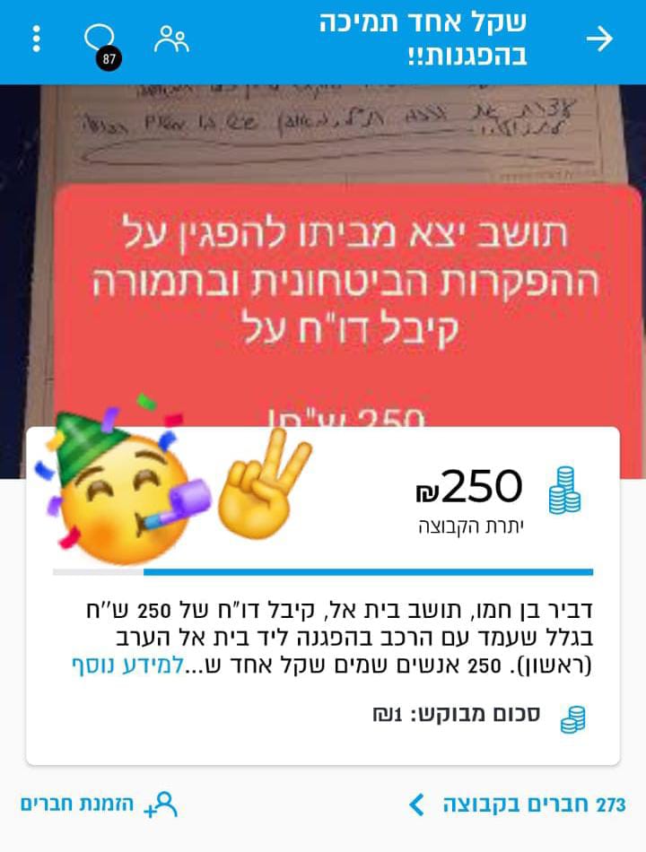 היוזמה צברה תאוצה במהירות ובתוך פחות מחצי שעה נאסף הסכום המלא, כשלא פחות מ-250 אנשים הביעו את תמיכתם בבן חמו ובמחאת התושבים כנגד הטרור.