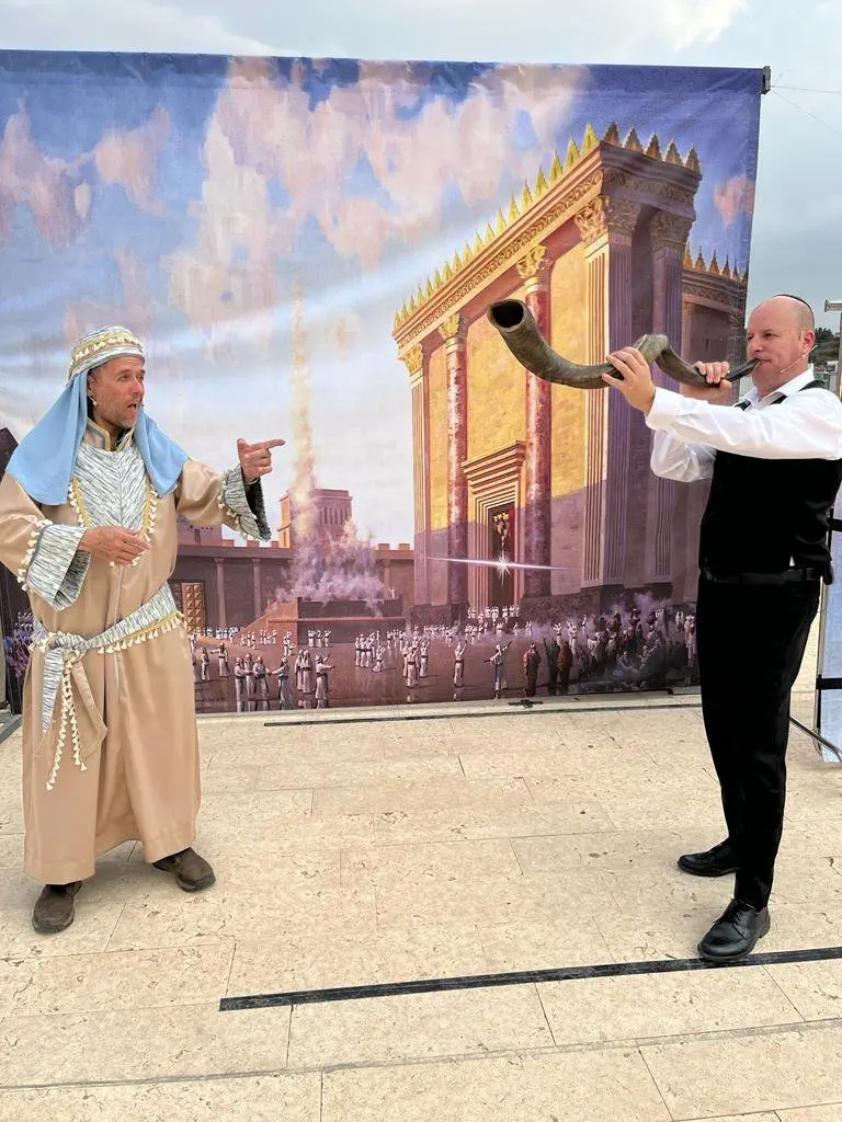 "עיקר מעמד ההקהל היה הקריאה בתורה על ידי מלך ישראל. במופע הזה אנחנו לוקחים את מעמד ההקהל ונותנים טעימה קטנה ממנו – הציפיה לבניית בית המקדש. אנחנו משלבים במעמד קטעי משחק, הצגות קטנות והמון מוזיקה בשיתוף הקהל. זה דבר שסוחף ומרים את הילדים והם נשארים עם טעם של ציפיה- מתי נזכה למעמד ההקהל האמיתי בבית המקדש. אנחנו שומעים תגובות של צופים רבים שהשתתפו בהצגה הזו עד היום וכולם מאוד מתרגשים. המופע מסתיים כשכל ילד שם את ידו על ראש חברו וכל אחד מבקש בקשה אישית. יש שם תחושת אחדות מאוד חזקה. כולם שרים יחד ישימך אלוקים וזה לא פחות ממצמרר. אני מגיע מעולם המוזיקה ורגיל לעשות הצגות ומופעים לילדים. עמית סופר מגיע מעולם הכלייזמרים. הוא אומן שופר המנגן שירים שלמים בשופר, זה דבר לא רגיל.