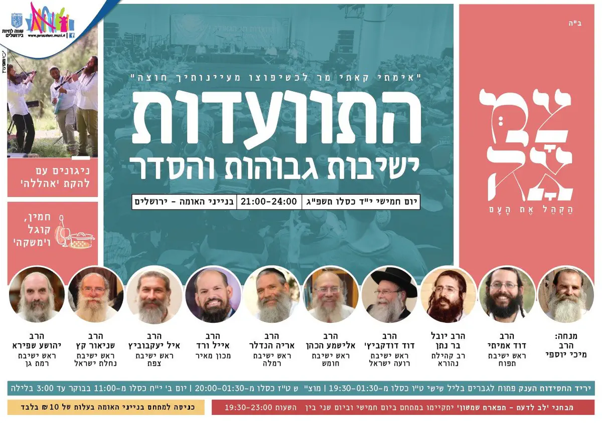 עשרה רבנים- ראשי ישיבות הסדר וגבוהות, יתקבצו יחד במסגרת אירועי צמאה שיתקיימו בעוד כשבוע בבנייני האומה, להתוועדות משותפת באווירה ייחודית ויעסקו בעבודת ה' מתוך שמחה, דבקות וניגון, בליווי להקת 'אהללה'. כל זה כמובן סביב חמין, קוגעל ומשקה.
