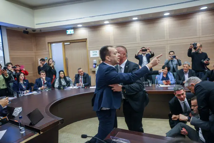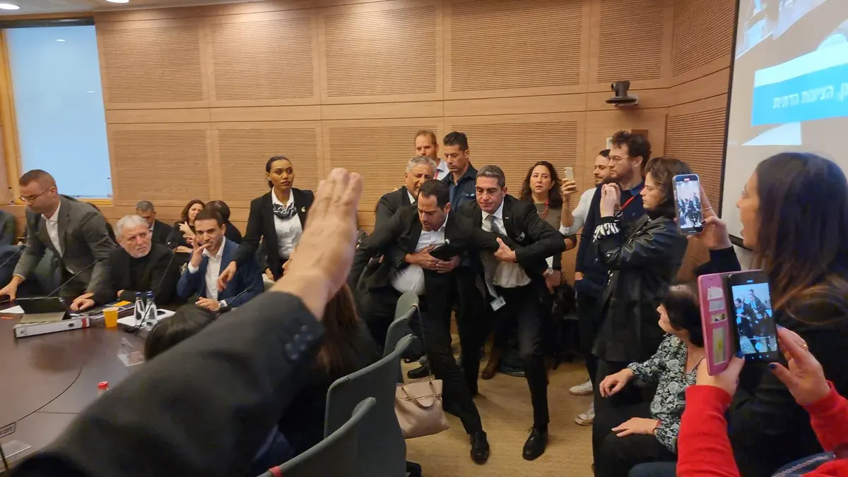 חברי הכנסת מסיעת יש עתיד פתחו בשירת ''אין לי ארץ אחרת'', ומהר מאוד התפתחו צעקות בין האופוזיציה לקואליציה. 14 ח"כים הוצאו מהדיון לאחר שהתפרעו, חלקם התיישבו על רצפת הוועדה וזינקו מעל שולחן כדי למנוע מיו"ר הוועדה ח"כ שמחה רוטמן להוציא אותם.