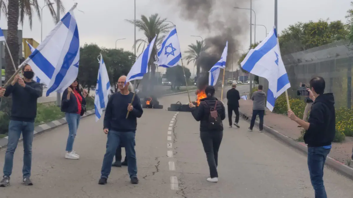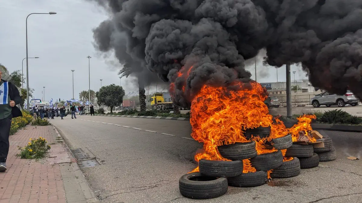 סמוך לנמל אשדוד הבעירו מפגינים צמיגים וחסמו את הכניסה הדרומית לנמל.
