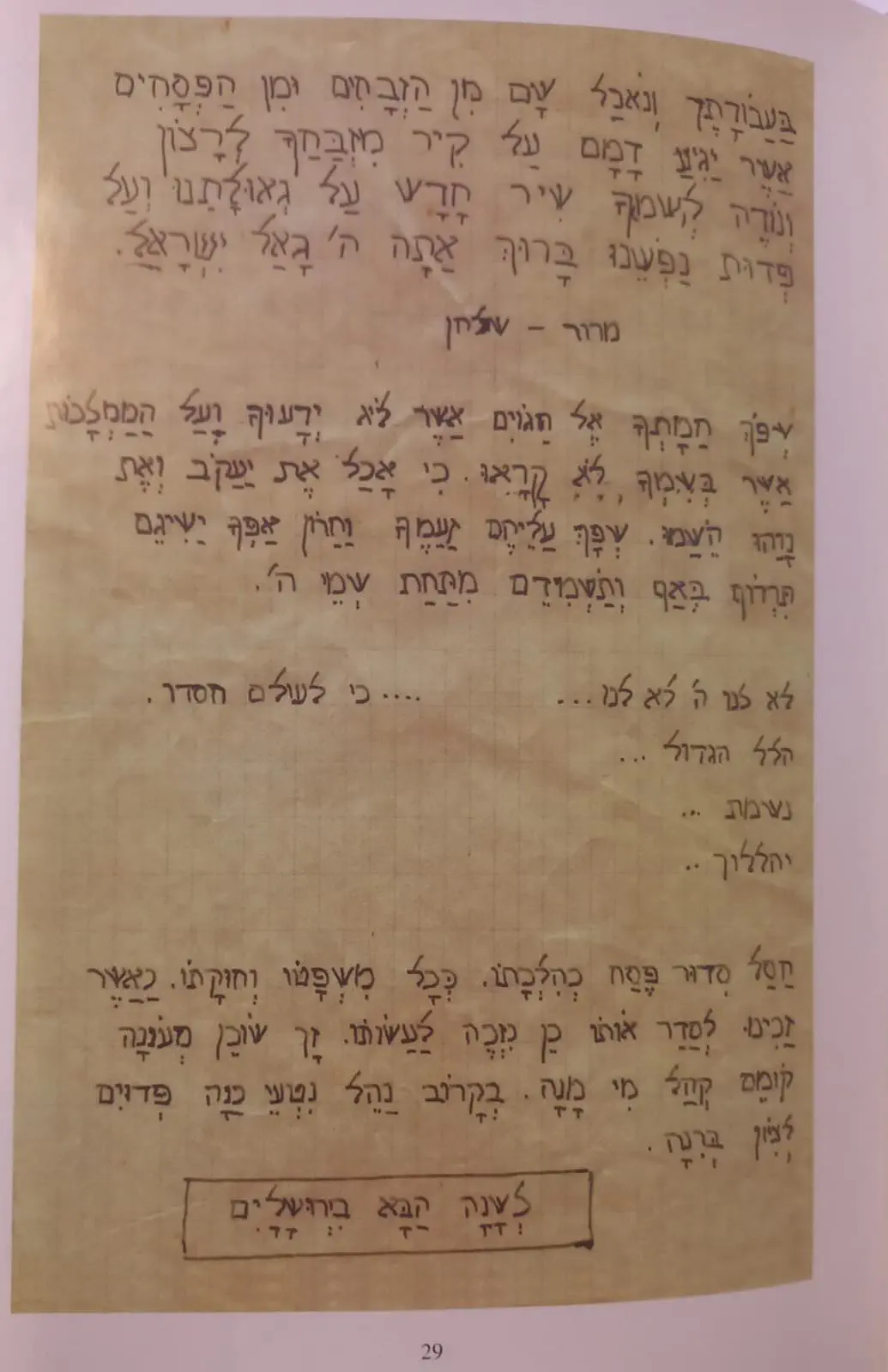 בתוך הסכנה, הרעב והפחד, סבא החליט לכתוב את ההגדה של פסח, אותה הם יקראו בליל הסדר. לא היו להם מצות, יין, וודאי לא סעודת חג. אבל היתה להם ההגדה שסבא שחזר וכתב מהזיכרון בלבד, והיא שרדה ונמצאת היום בידינו.