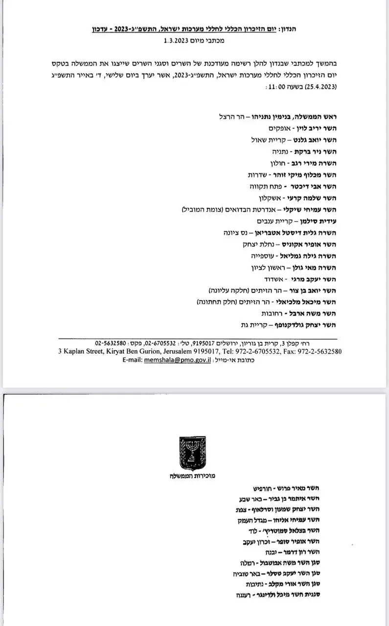 שר הביטחון גלנט ינכח בבית העלמין בקריית שאול, שר המשפטים לוין באופקים, שרת התחבורה רגב בחולון ושר התקשורת שלמה קרעי באשקלון.