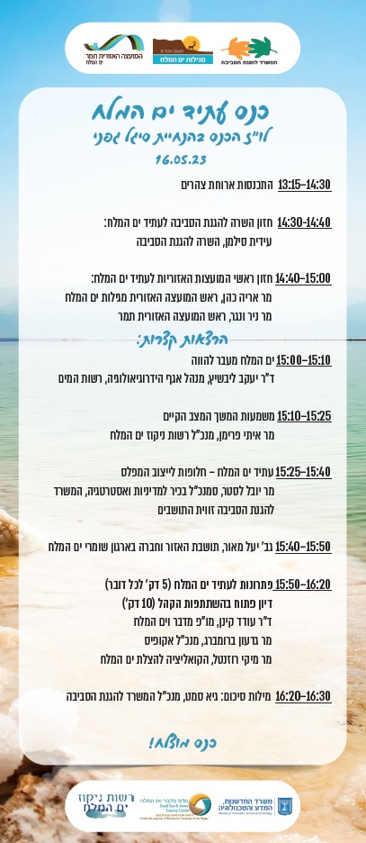 המשרד להגנת הסביבה, המועצה האזורית מגילות ים המלח והמועצה האזורית תמר יקיימו ביום שלישי בצהריים כנס מיוחד במעמד השרה עידית סילמן, ראשי המועצות האזוריות, תושבים וגורמי מקצוע.