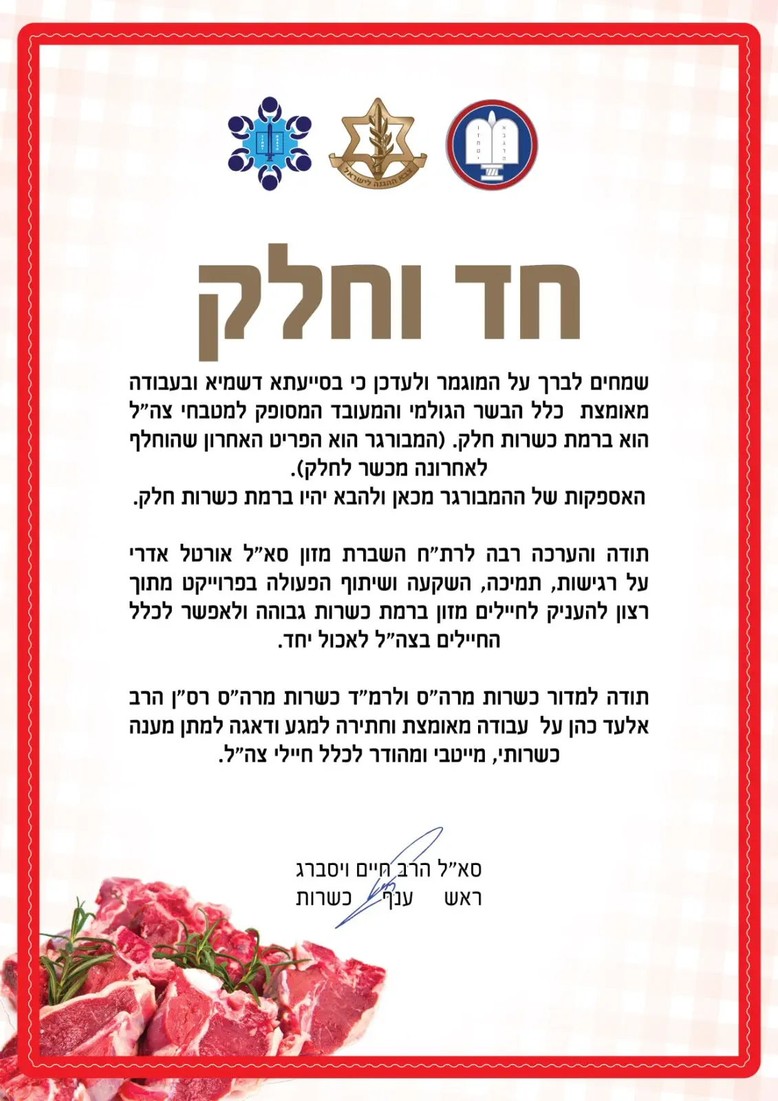 את המהלך השלים ההמבורגר שהיה הפריט האחרון שהוחלף לאחרונה מכשר לחלק. האספקה של ההמבורגר מכאן ולהבא תהיה ברמת כשרות חלק.
