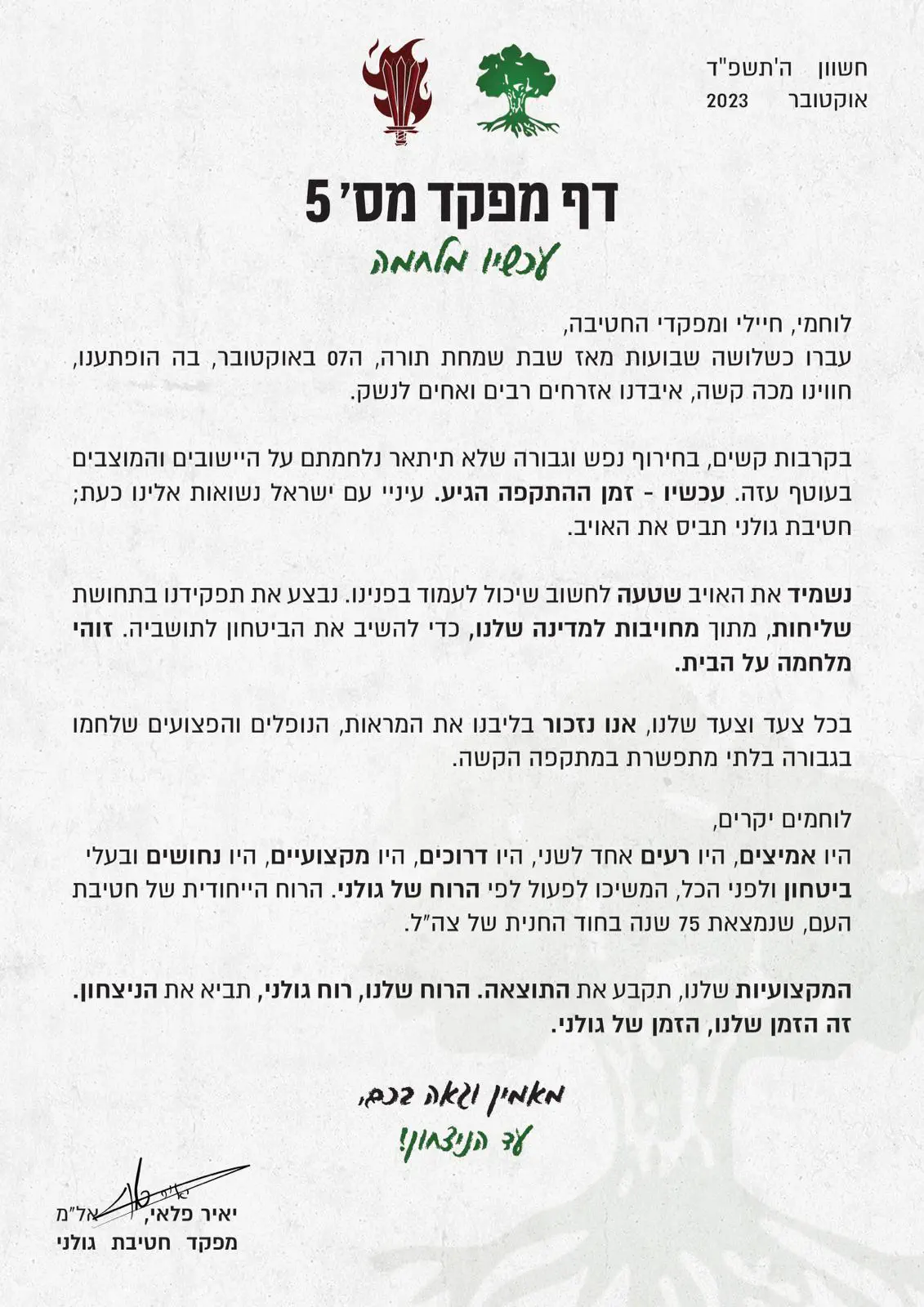 צה"ל פרסם בצהריים (שלישי) את פקודת ההתקפה של מפקד פיקוד הדרום, אלוף ירון פינקלמן לכוחות היבשה הפועלים ברצועת עזה.