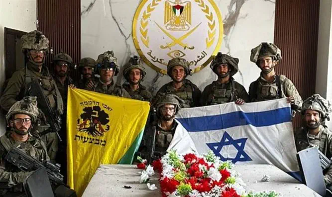 בתוך כך, לוחמי גולני הצטלמו עם דגלי ישראל בביתו של מושל עזה.