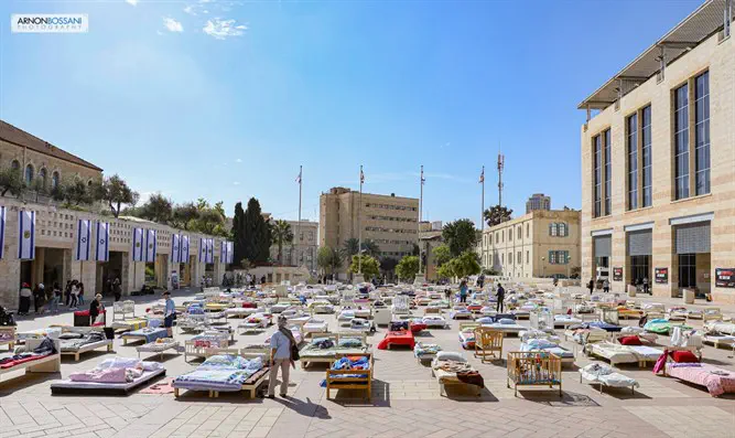 מיצג מיטות החטופים בכיכר ספרא בירושלים