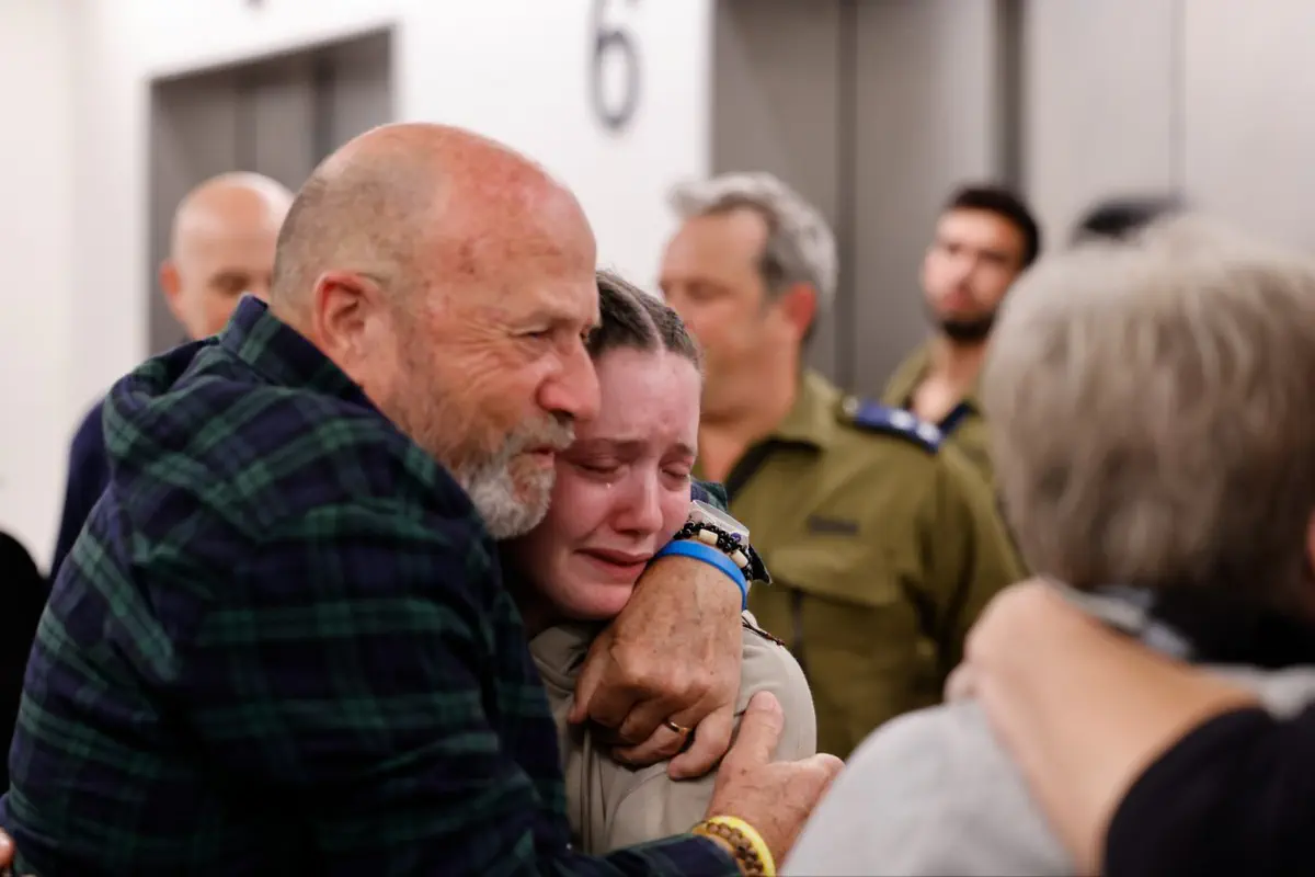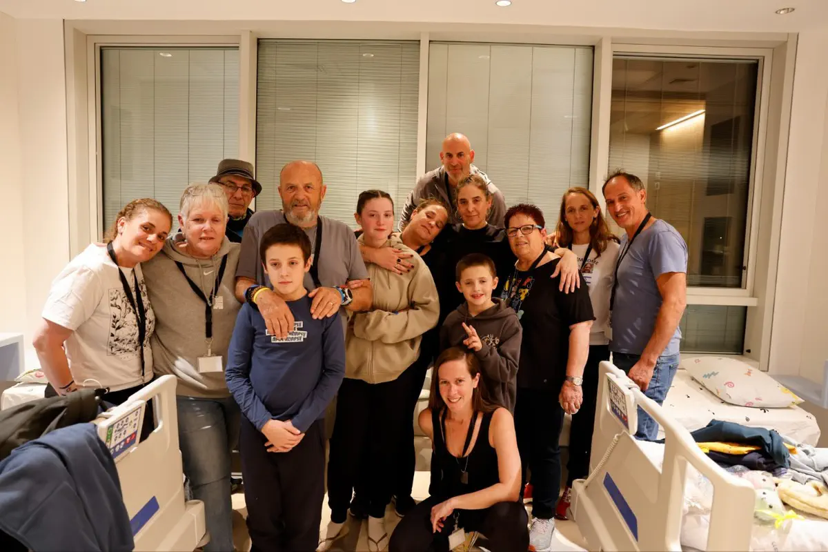 בני משפחת גולדשטיין-אלמוג ששוחררו אמש מהשבי וחזרו לישראל התאחדו עם משפחתם בבית החולים שניידר.