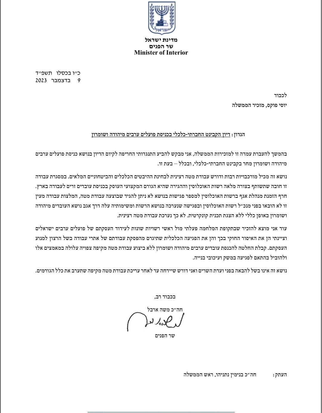 במכתבו ציין ארבל שמאז תחילת המלחמה הוא פעל מול ראשי רשויות בארץ לעידוד העסקתם של פועלים ערבים ישראלים, והוא טוען כי החלטה על הכנסת עובדים ערבים מיהודה ושומרון ללא ביצוע עבודת מטה מקיפה עלולה לפגוע במאמצים אלו ולהוביל בהתאם לפגיעה במשק ועיכובי בנייה.