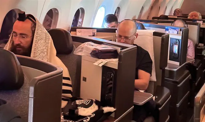 במחלקת העסקים בטיסה מארה"ב לישראל נצפו ראש הממשלה לשעבר נפתלי בנט והמנצח של מקהלת "מלכות" פנחס ביכלר כשהוא עטור בטלית ותפילין.