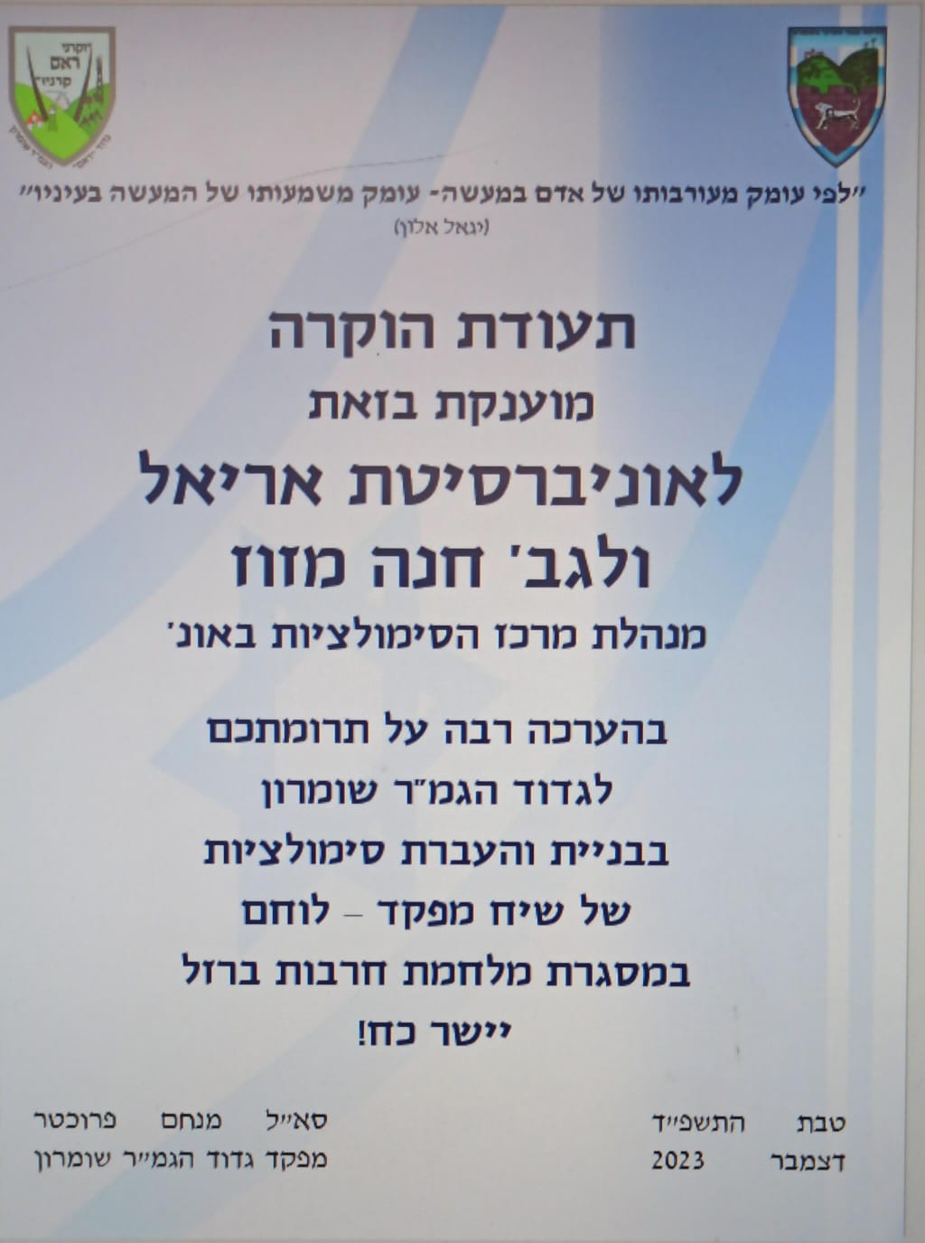 סא"ל מנחם פרוכטר, מפקד הגמ"ר שומרון העניק תעודת הוקרה לאוניברסיטת אריאל ולחנה מזוז, מנהלת מרכז הסימולציות באוניברסיטה, על תרומה מיוחדת לגדוד הגמ"ר שומרון בבניית והעברת סימולציות של שיח מפקד – לוחם במהלך המלחמה.