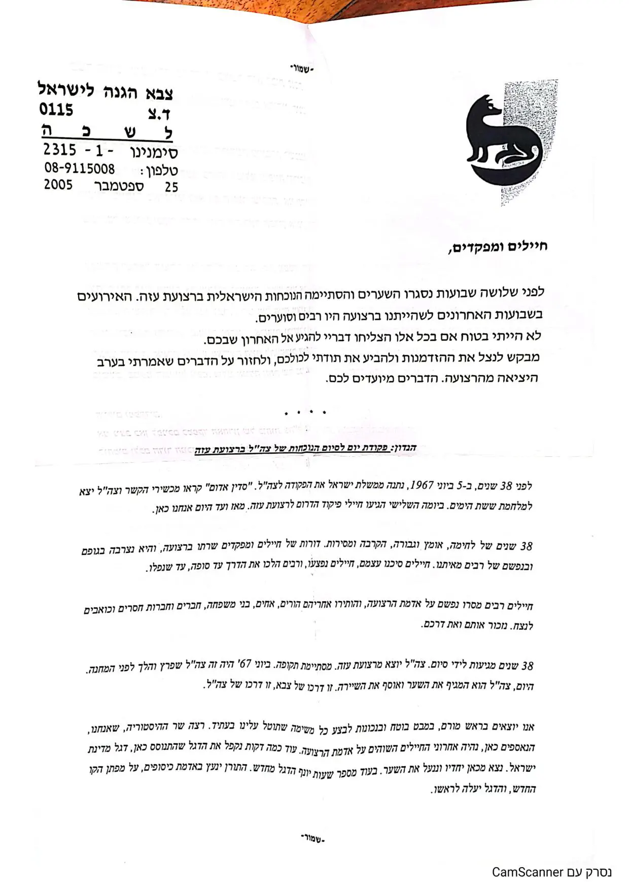 "שלום לכולם, אנחנו פה בחאן יונס, לפני 19 שנה בשירות הסדיר היינו בציר פילדלפי, היינו הכוחות האחרונים שיצאו מהרצועה, הדגל הזה שכב אצלי 19 שנה, כולל המכתב שקיבלתי ממפקד האוגדה, תת אלוף אביב כוכבי", סיפר צבי.