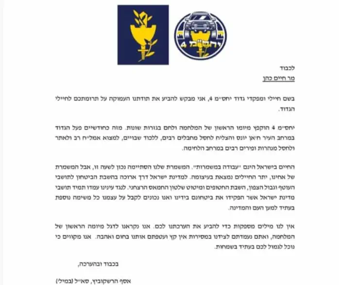 "לכבוד חיים כהן, בשם חיילי ומפקדי גדוד יחס"מ 4, אני מבקש להביע את תודתנו העמוקה על תרומתכם לחיילי הגדוד", כתב המג"ד.