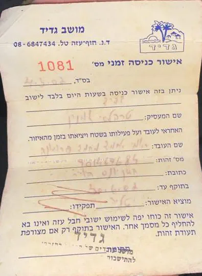 חיילי צה"ל איתרו בבית בעזה אישור כניסה זמני מלפני 22 שנה של פועל מחאן יונס אשר עבד אצל אמנון טרבלסי מהישוב גדיד בגוש קטיף.