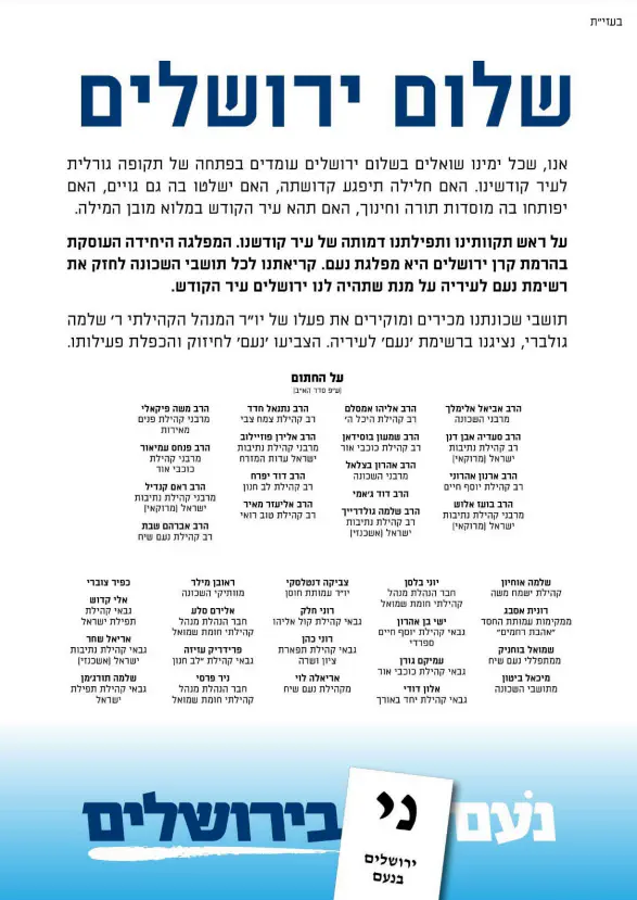 רשימת נעם בירושלים המתמודדת לראשונה בבחירות לעיריית ירושלים בהובלתו של עו"ד אלדד רבינוביץ, זוכה לתמיכה רחבה בציבור הירושלמי שמעוניין בחיזוק הזהות היהודית של העיר.