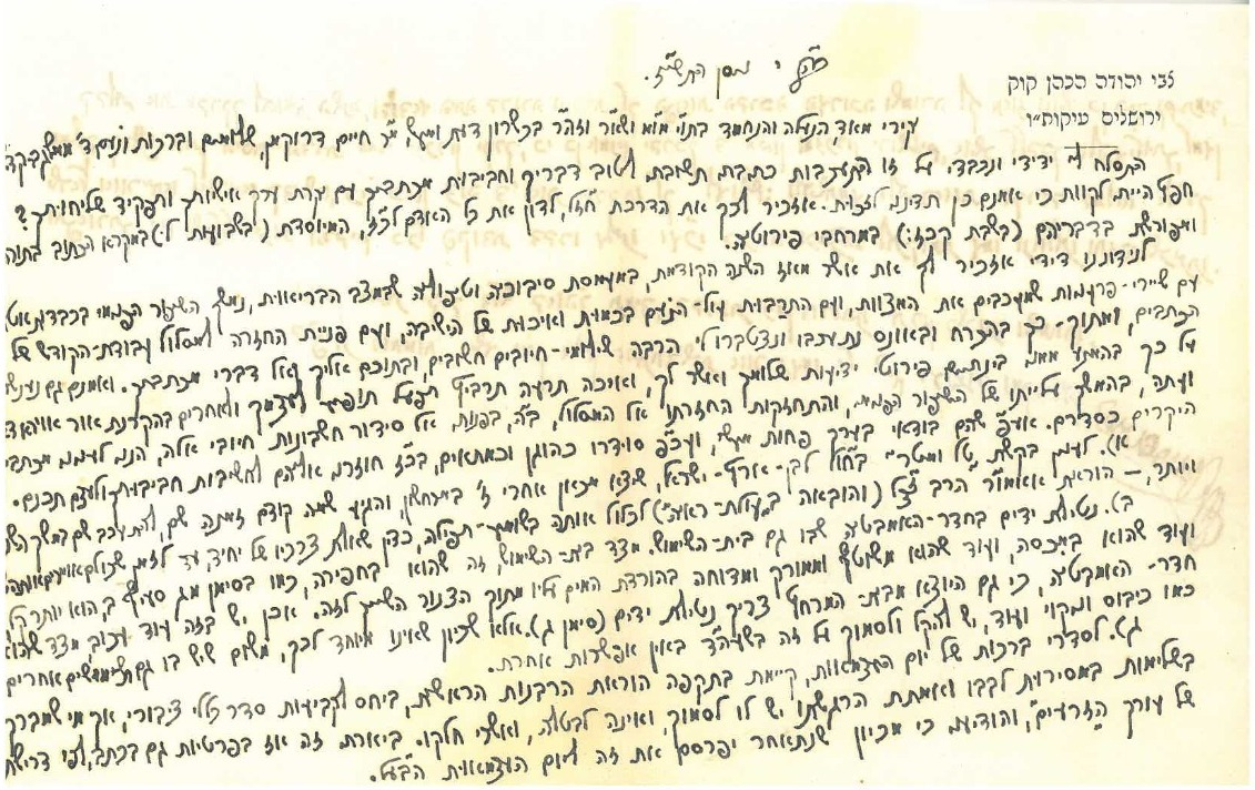 לנידוננו דידי אזכיר לך את אשר מאז השנה הקודמת, במעמסת סיבוכיה וטיפוליה שבמצב הבריאות נמשך השיפור הפנימי בכבדות (..) עם שיירי (פרעמות?) שמעכבים את המצוות, ועם היתרבות עול הנועם בכמות ואיכות של הישיבה, ועם פניית החזרה למסלול עבודת הקודש של הכתבים, ומתוך כך בהכרח ובאונס נתעכבו ונצטברו לי הרבה שילומי חיובים חשובים, ובתוכם אליך ואל דברי מכתביך. ואמנם גם (נענשתי?) על כך בהימנע ממני בינתיים פירוטי ידיעות שלומך ואשר לך, ואיכה תרעה תרביץ תפעל תופיע לעצמך ולאחרים בהקרנת אור אווירא (דא"י?).