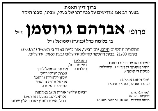 "ברוך דיין האמת, בצער רב אנו מודיעים על פטירתו של בעלי, אבינו, סבנו היקר, פרופ' אברהם גרוסמן זז"ל, בן בלומה פרל (פנינה) ושמואל ז"ל", נכתב.