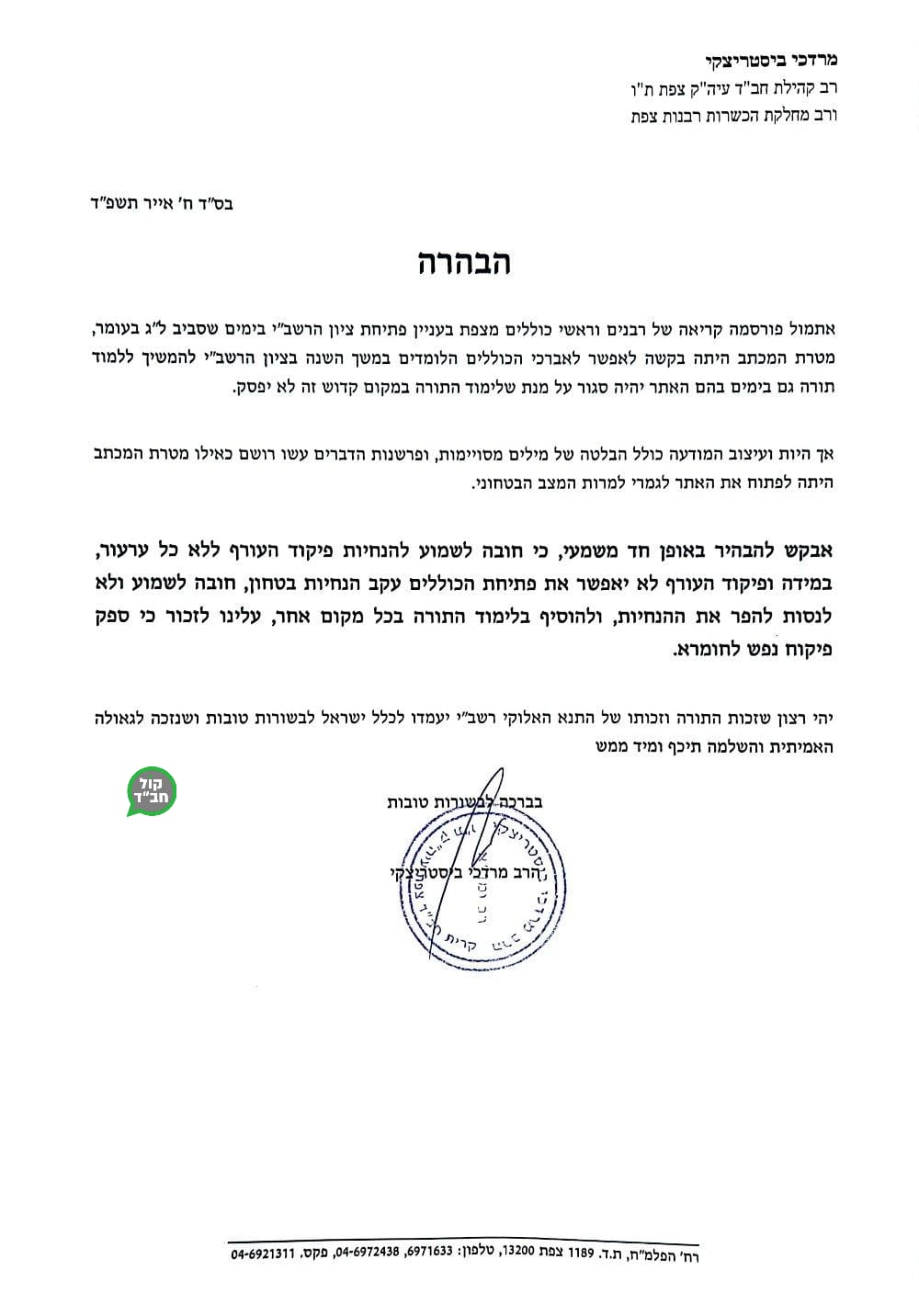 "אבקש להבהיר באופן חד משמעי כי חובה לשמוע להנחיות פיקוד העורף ללא כל ערעור, במידה ופיקוד העורף לא יאפשר את פתיחת הכוללים עקב הנחיות בטחון, חובה לשמוע ולא לנסות להפר את ההנחיות. עלינו לזכור כי ספק פיקוח נפש לחומרא", כתב הרב.