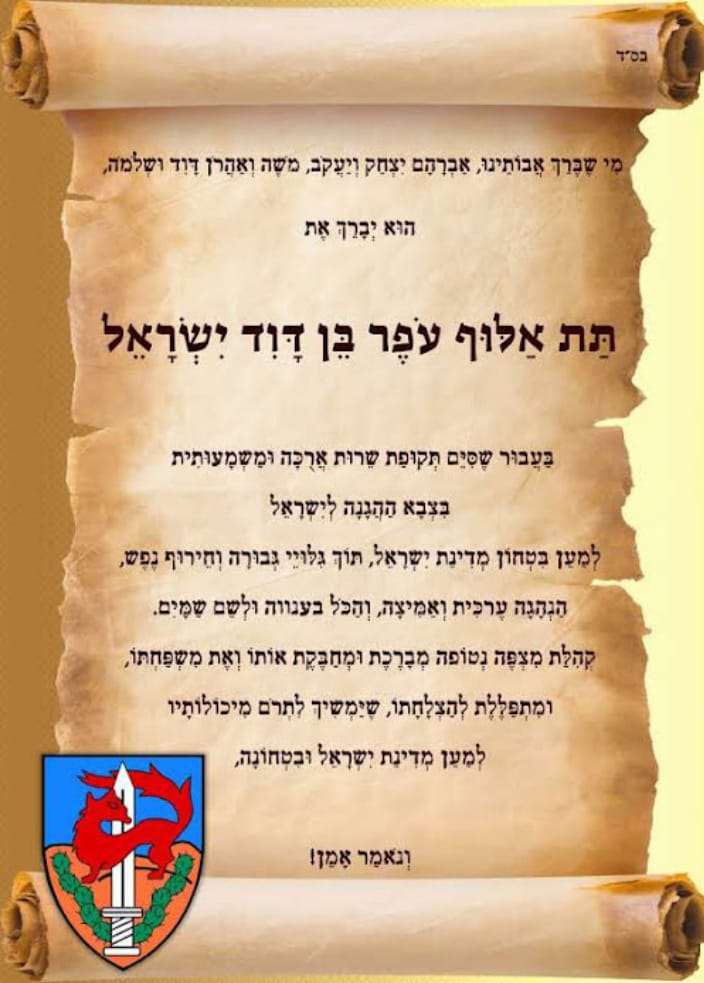 "מי שברך אבותינו, אברהם יצחק ויעקב, משה ואהרון דוד ושלמה, הוא יברך את תת אלוף עופר בן דוד ישראל, בעבור שסיים תקופת שרות ארוכה ומשמעותית בצבא הגנה לישראל, למען בטחון מדינת ישראל", נאמר עליו בברכה.