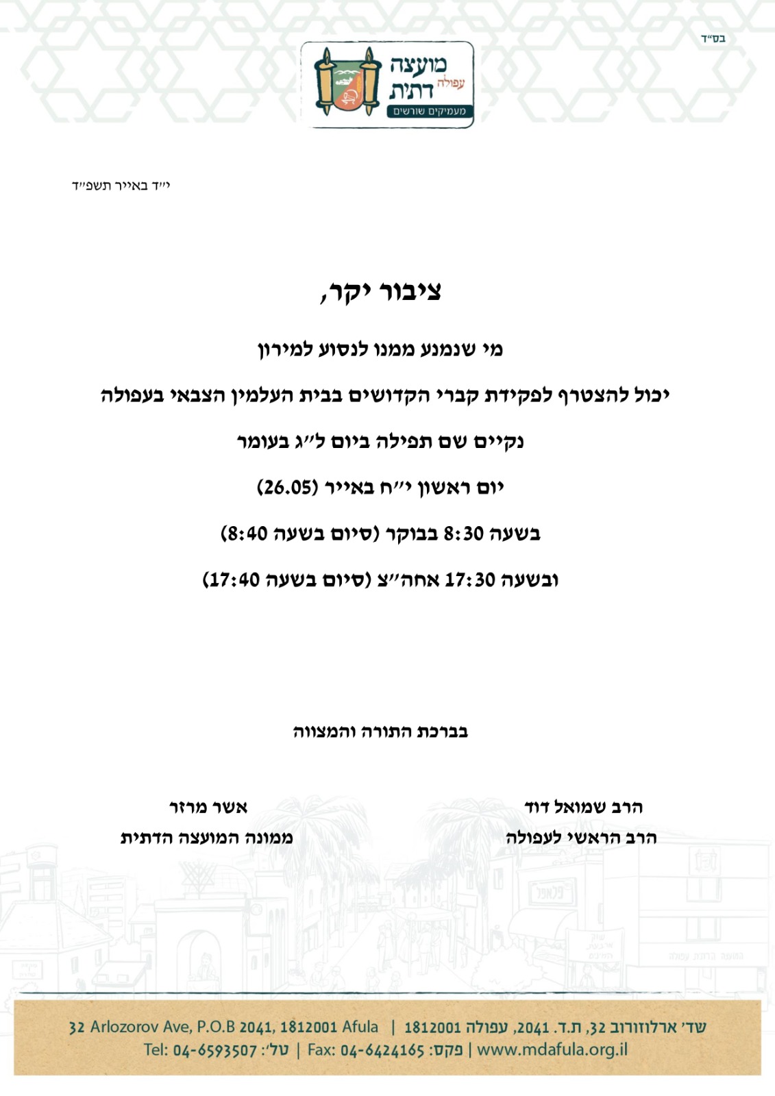 "ציבור יקר, מי שנמנע ממנו לנסוע למירון, יכול להצטרף לפקידת קברי הקדושים בבית העלמין הצבאי בעפולה, נקיים שם תפילה ביום ראשון י"ח אייר בשעה 8:30 בבוקר ובשעה 17:30", כתב רב העיר, יחד עם ראש המועצה הדתית הממונה אשר מרזר.