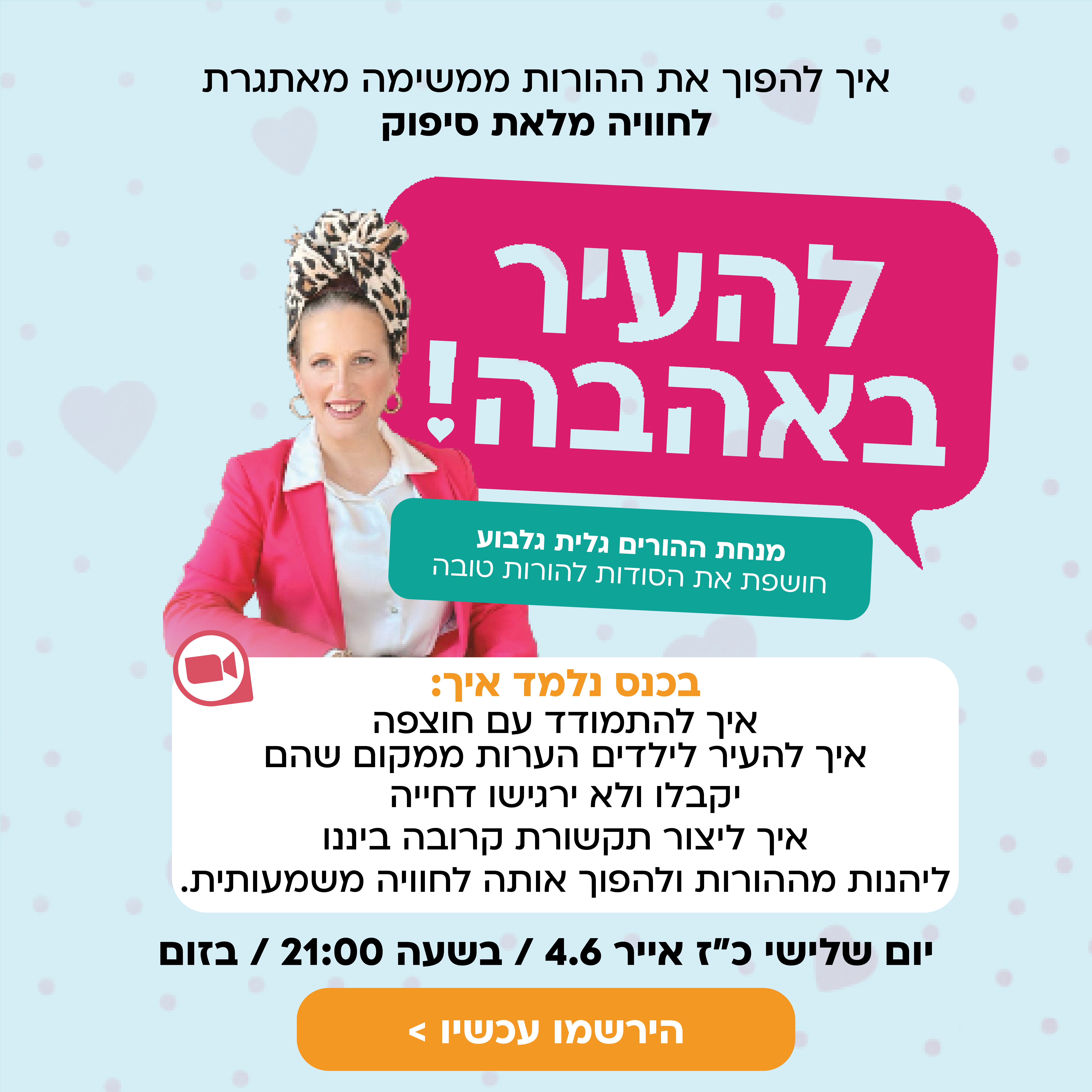 "בדיוק בעבור זה יצרתי את הכנס 'להעיר באהבה' שיתקיים ביום שלישי הקרוב," מספרת גלית. "מעל 1,500 אבות ואמהות כבר נרשמו למשדר החינמי שיעסוק בנושא הזה שעשוי להיות רגיש במיוחד לרבים מאיתנו: הערות והעברת ביקורת.