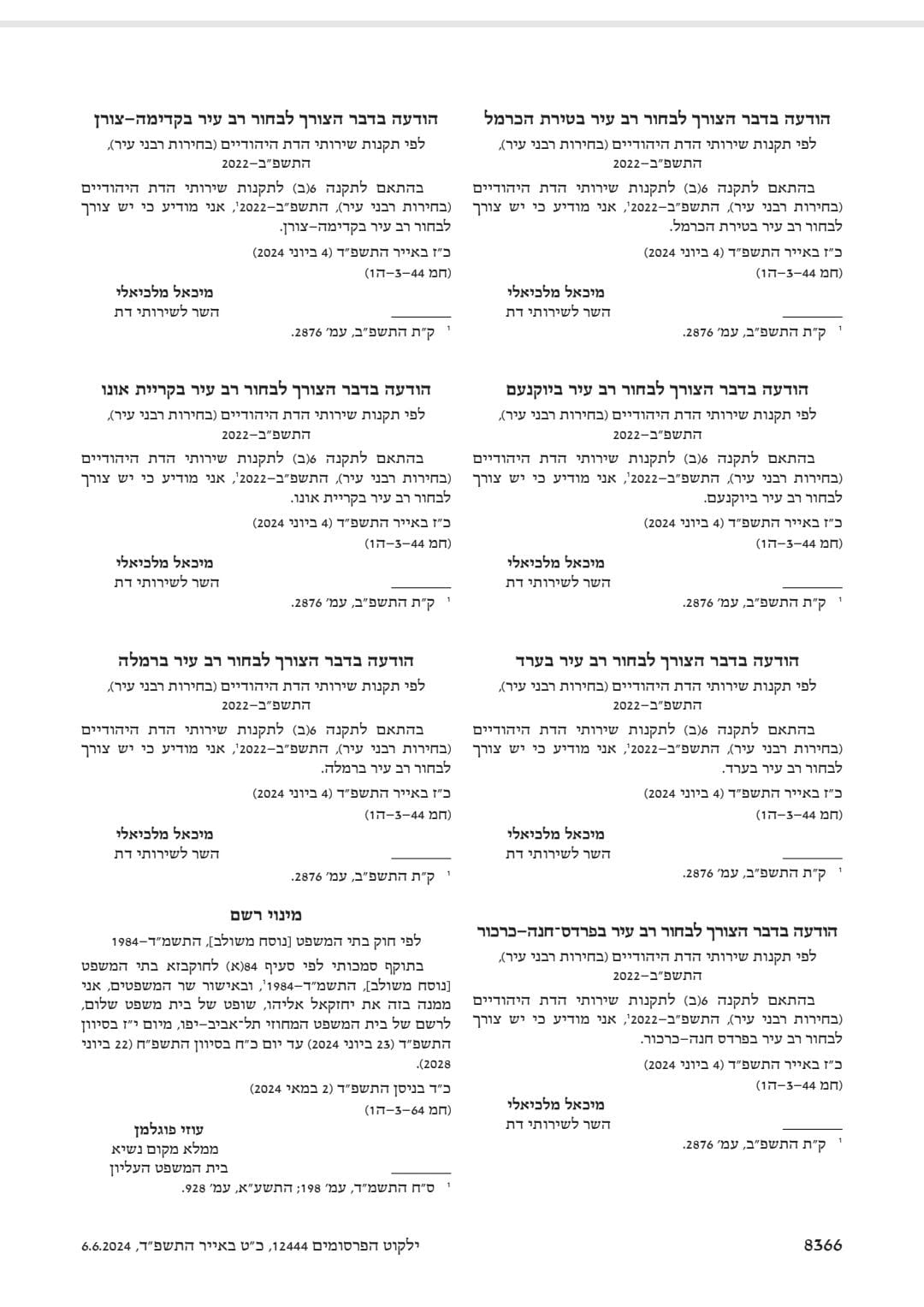 מחממים מנועים: המשרד לשירותי דת פרסם על כוונתו להתחיל תהליך בחירת רבני ערים במספר ערים בארץ אשר אין רבנים מכהנים או רבנים אשר חצו את גיל ה-80.