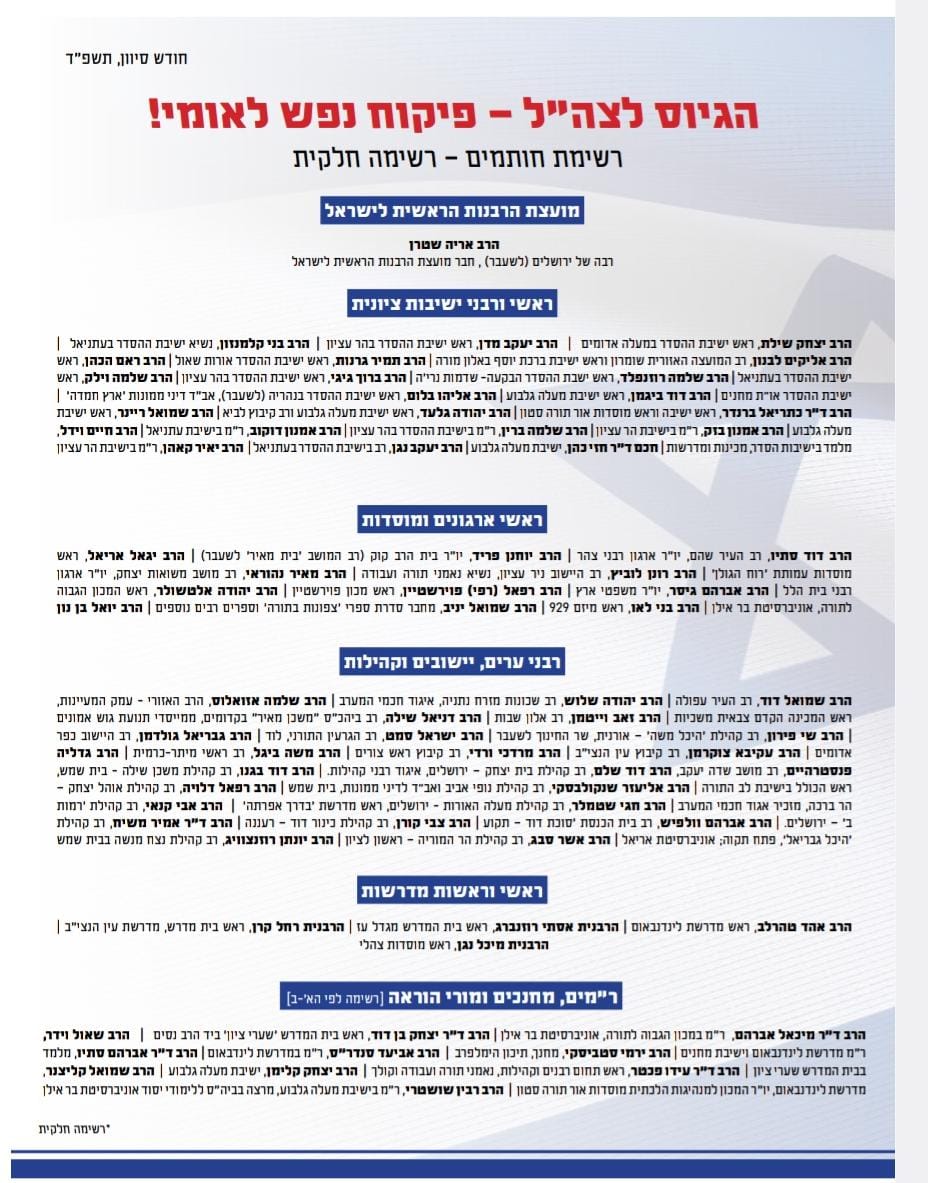 "אנו קוראים לנבחרי הציבור, מכל גווניו וחלקיו, להתעשת, לא להתעלם מדרישה מוסרית ותורנית צודקת זו, להתעלות מעל לשיקולים הפוליטיים הצרים ולקדם במשותף מתווה אמיתי אשר יוביל להגברה משמעותית של השתתפות כל חלקי החברה, כולל החברה החרדית, בהגנת העם והארץ, ולנקוט בכל האמצעים הנדרשים לכך", סיכמו הרבנים את קריאתם.