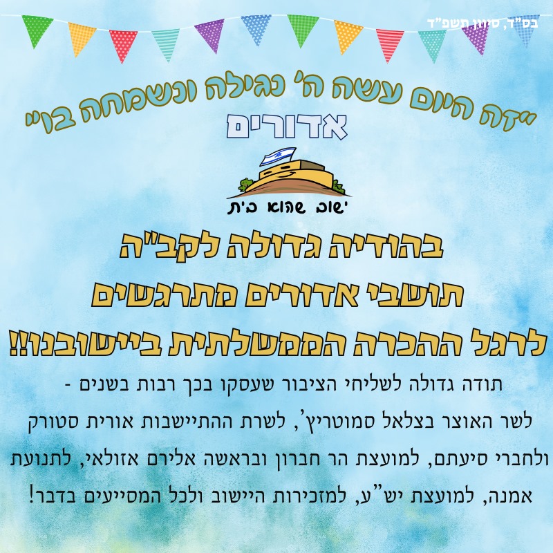 "בהודיה גדולה לקב"ה תושבי אדורים מתרגשים לרגל ההכרה הממשלתית בישובנו", כתבו ביישוב. הם הודו לשרי הממשלה ואישי הציבור. "תודה גדולה לשליחי הציבור שעסקו בכך רבנות בשנים - לשר האוצר בצלאל סמוטריץ', לשרת ההתיישבות אורית סטרוק ולחברי סיעתם, למועצת הר חברון ובראשה אלירם אזולאי, לתנועת אמנה, למועצת יש"ע, למזכירות היישוב ולכל המסייעים בדבר".