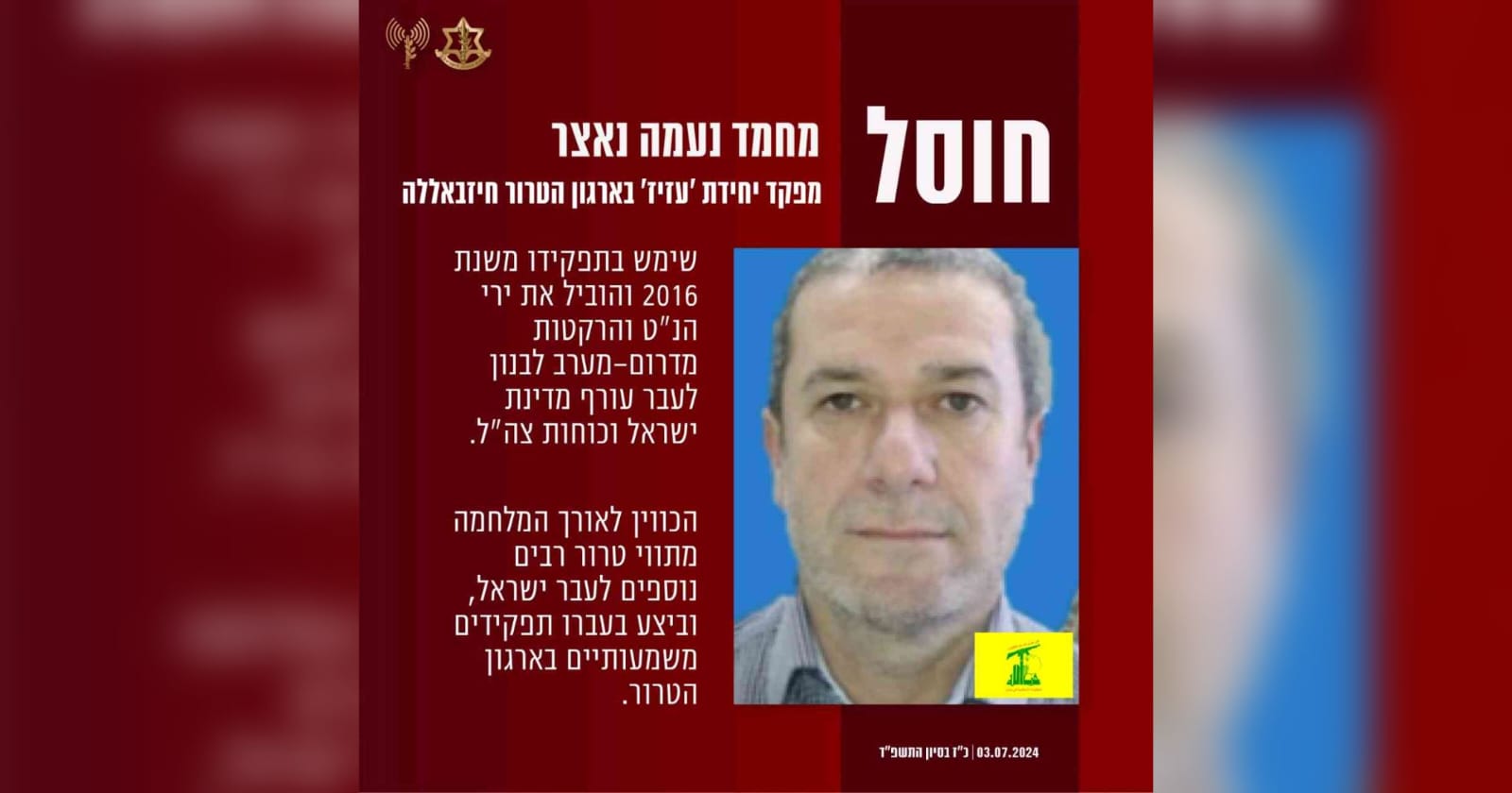 מוחמד נעמה נאסר הוא למעשה המקביל של המפקד הבכיר שחוסל לפני כמה שבועות, אבו טאלב שהיה אחראי על הגזרה המזרחית בדרום לבנון. בסך הכול, חיזבאללה אישר את מותם של 360 פעילי הארגון מתחילת המלחמה.